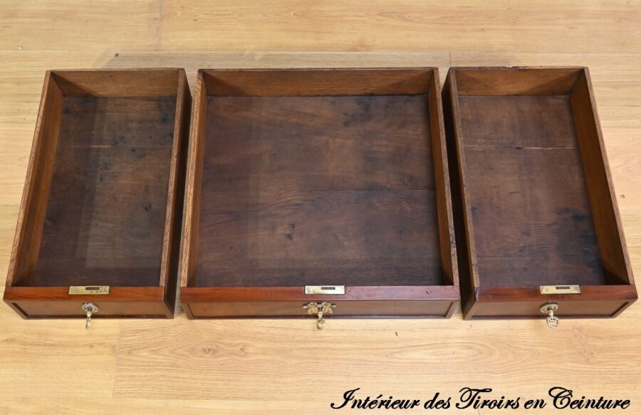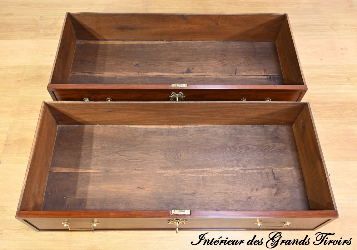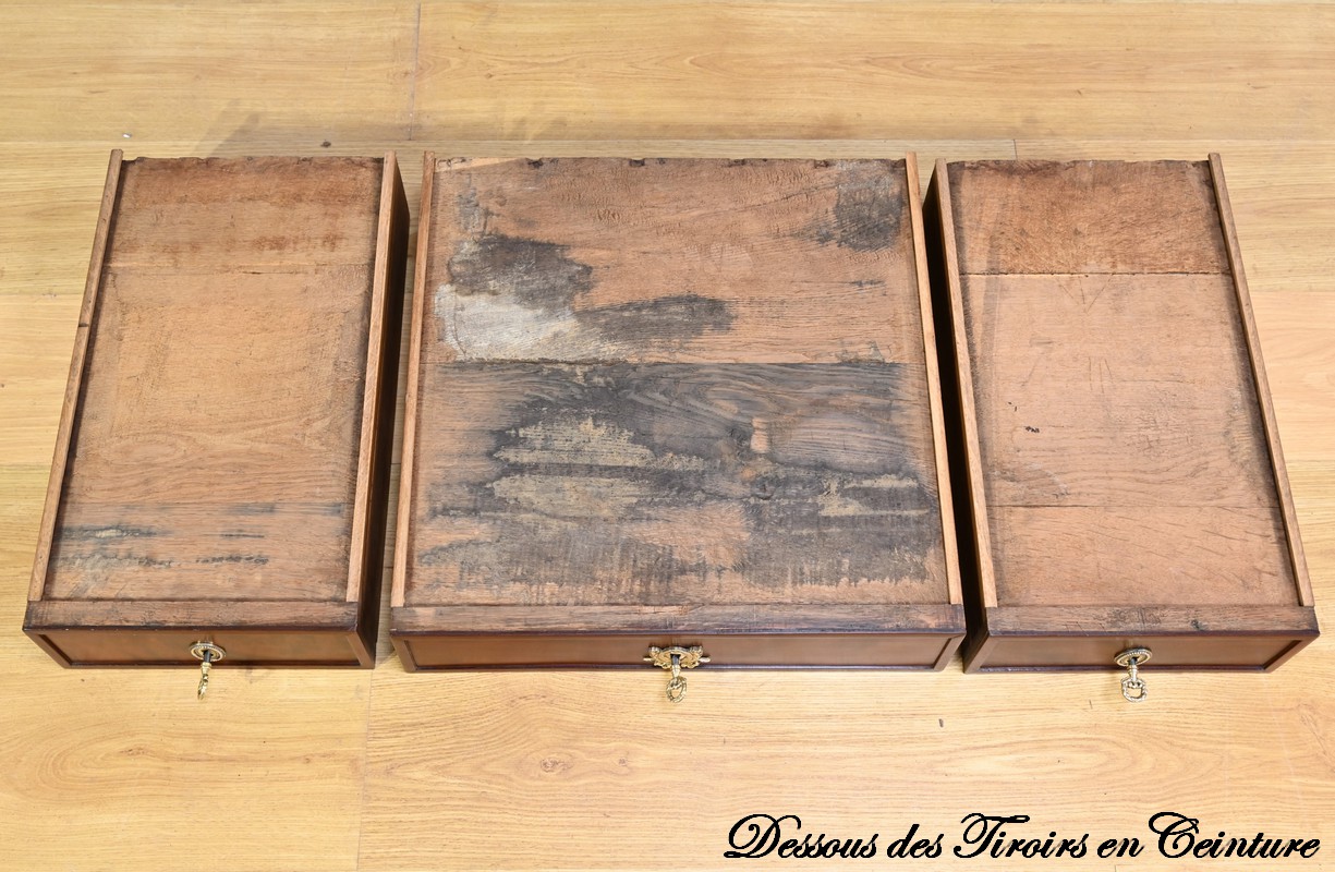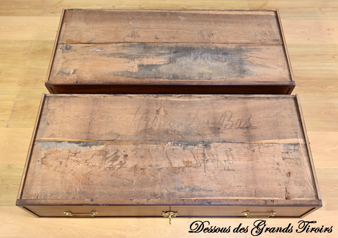 En dessous, deux tiroirs, de style identique, mais plus grands, accompagnés de poignées tombantes et munis également d’entrées Louis XVI.