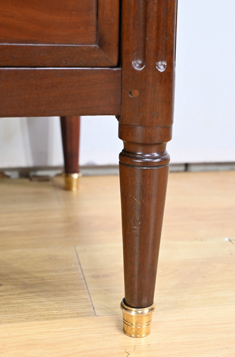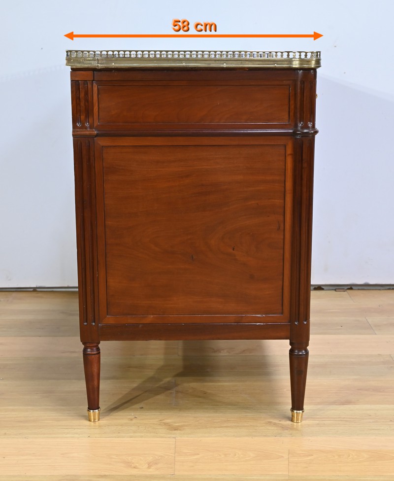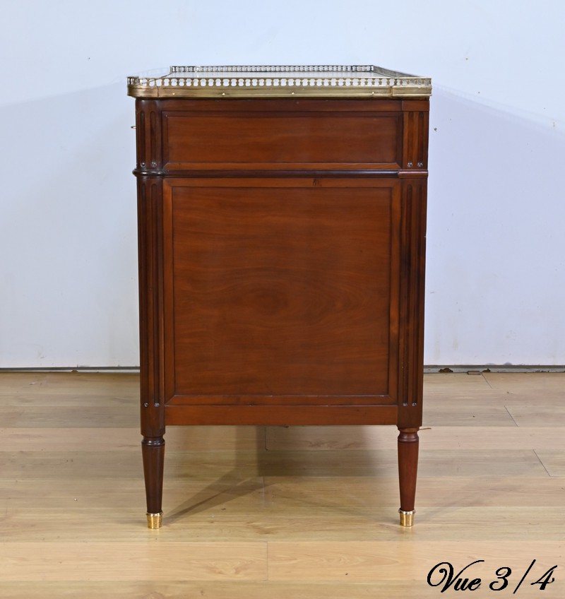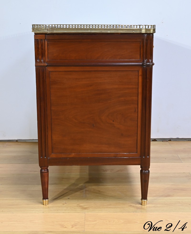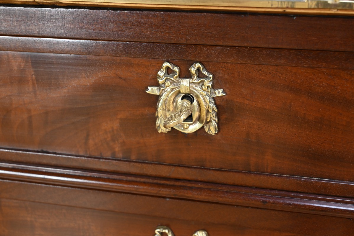 En dessous, deux tiroirs, de style identique, mais plus grands, accompagnés de poignées tombantes et munis également d’entrées Louis XVI.