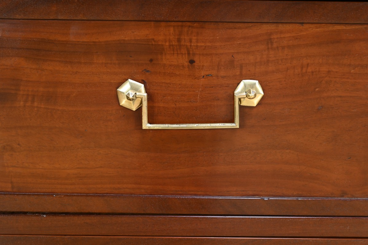 Cette commode en acajou de Cuba ouvre en ceinture par trois tiroirs à léger défoncement ceint de baguettes avec entrées ovales et enrubannées en laiton.