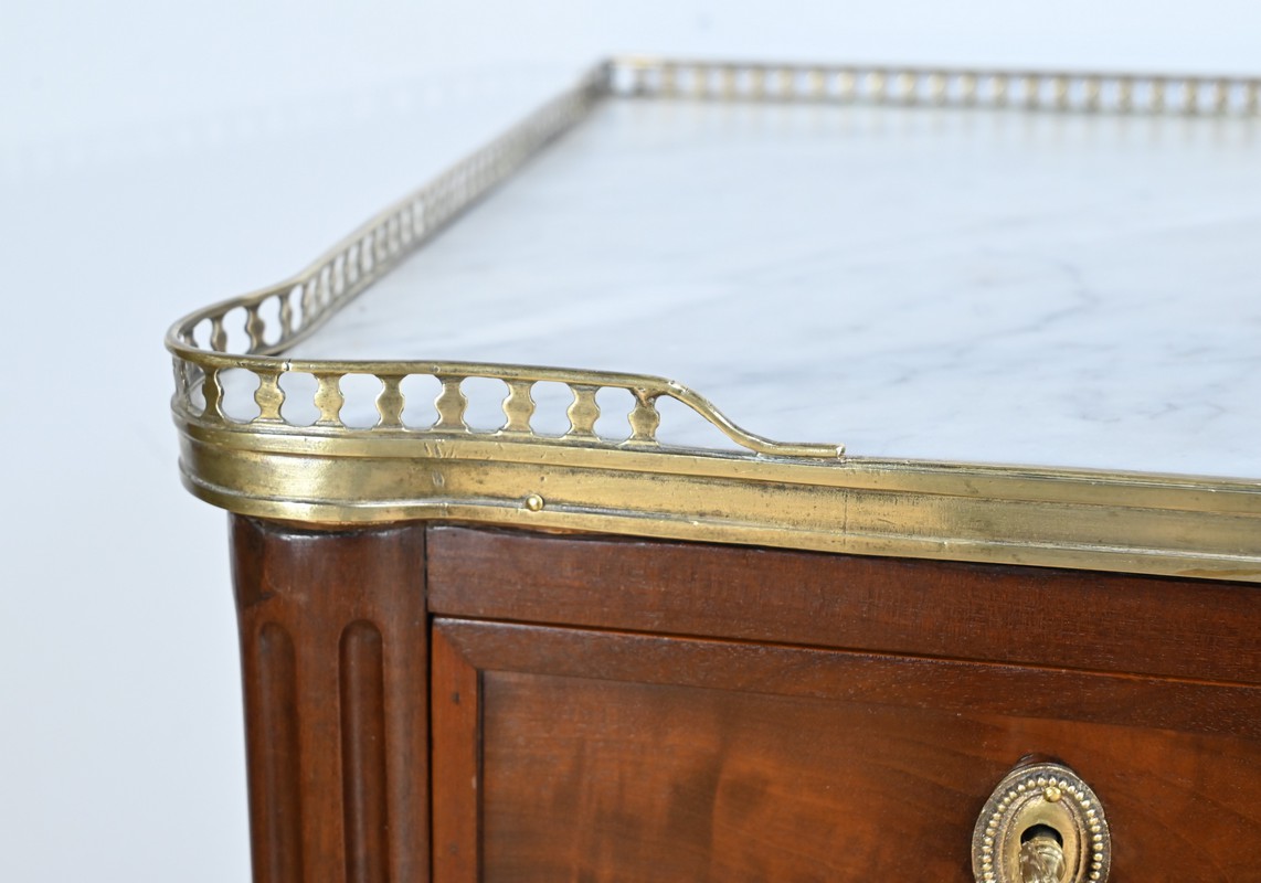 Ce meuble est chapeauté d’un marbre de carrare à ressaut mis en valeur par une galerie ajourée en laiton.