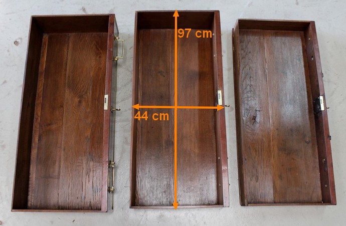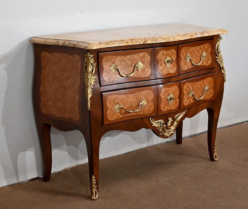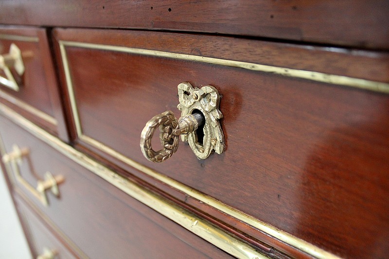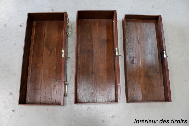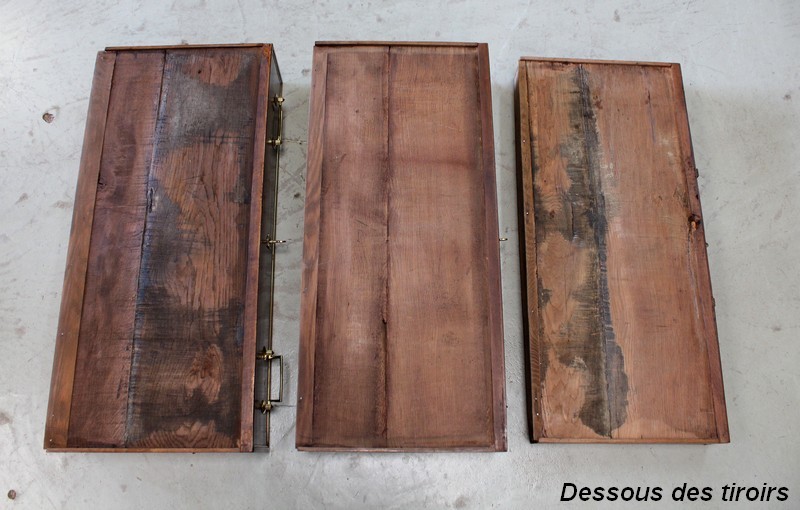 La Ceinture, délimitée par une Baguette demi rond en Laiton, est composée d’un unique tiroir, malgré une façade qui en simule trois. En dessous, cette Commode offre deux autres tiroirs, disposés sur deux rangs, d’une profondeur identique de 19 cm. Tous sont pourvus de deux poignées tombantes et d’une entrée Ouvragées, le tout d’Origine. Ils sont également équipés de serrures en état de fonctionnement, dotées de leurs clés. L’intérieur des tiroirs ainsi que les « anti-poussieres » sont en Chêne.