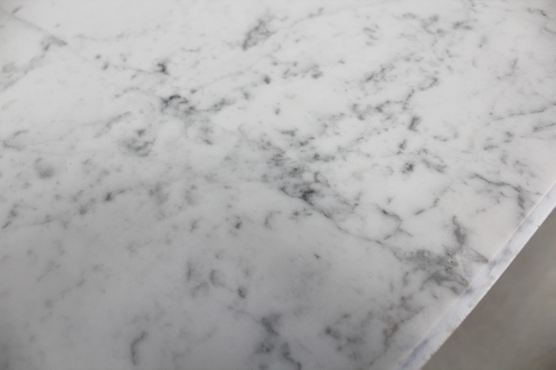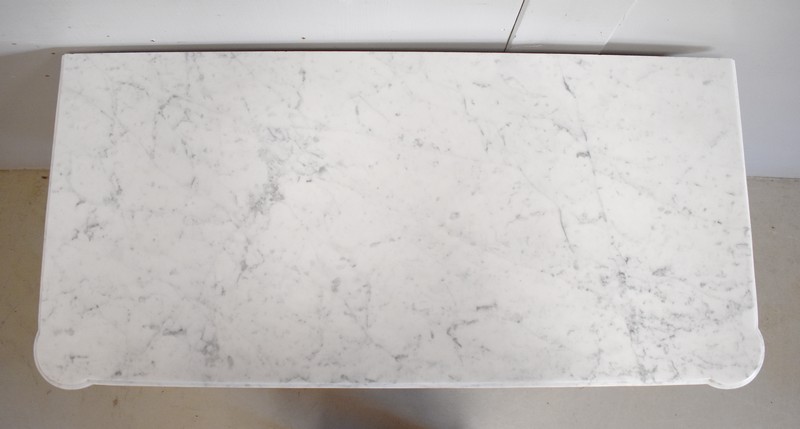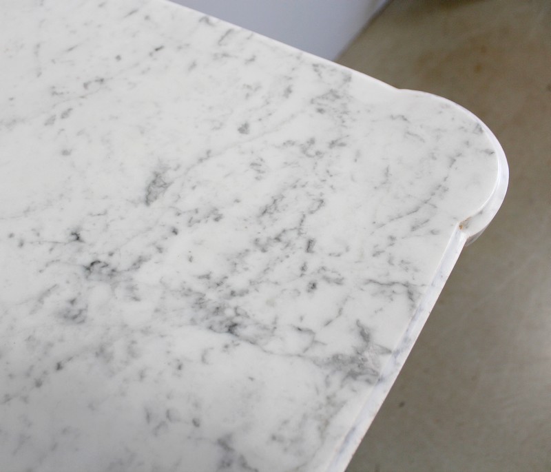 Son Plateau est en Marbre Blanc de Carrare légèrement veiné, qui présente en son pourtour une Gorge, et qui épouse les lignes des pieds en quart de rond de ce Meuble chargé d’Histoire.