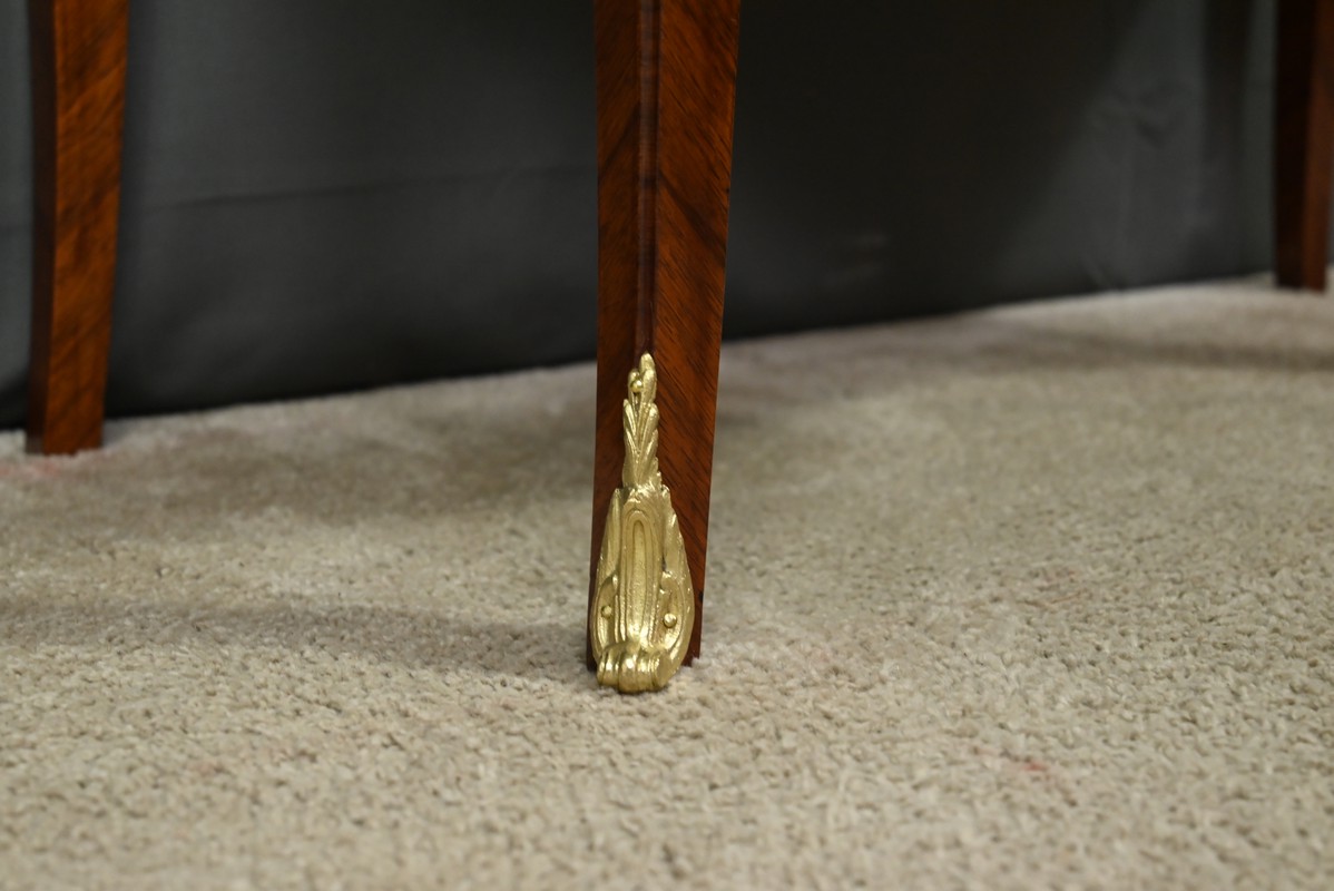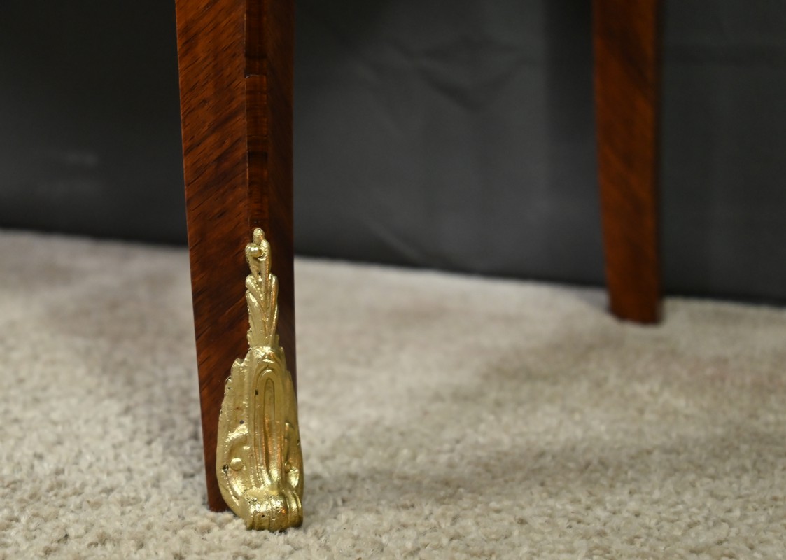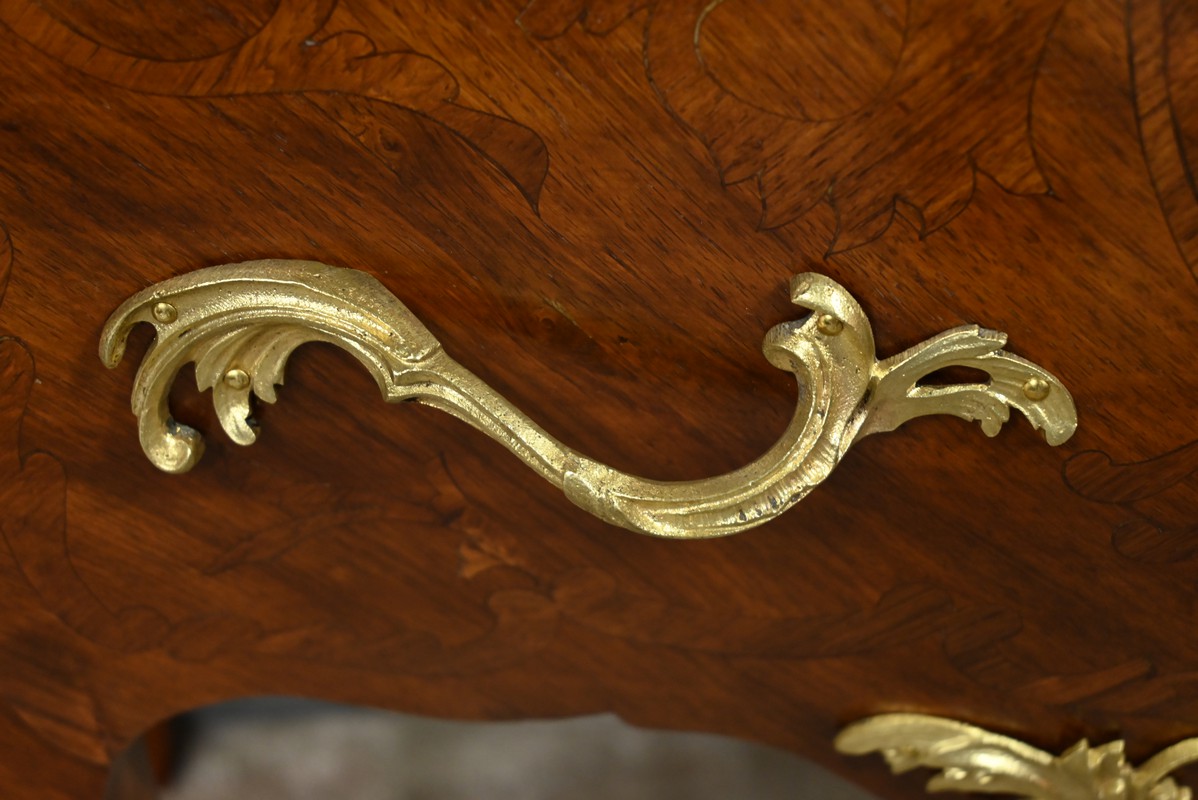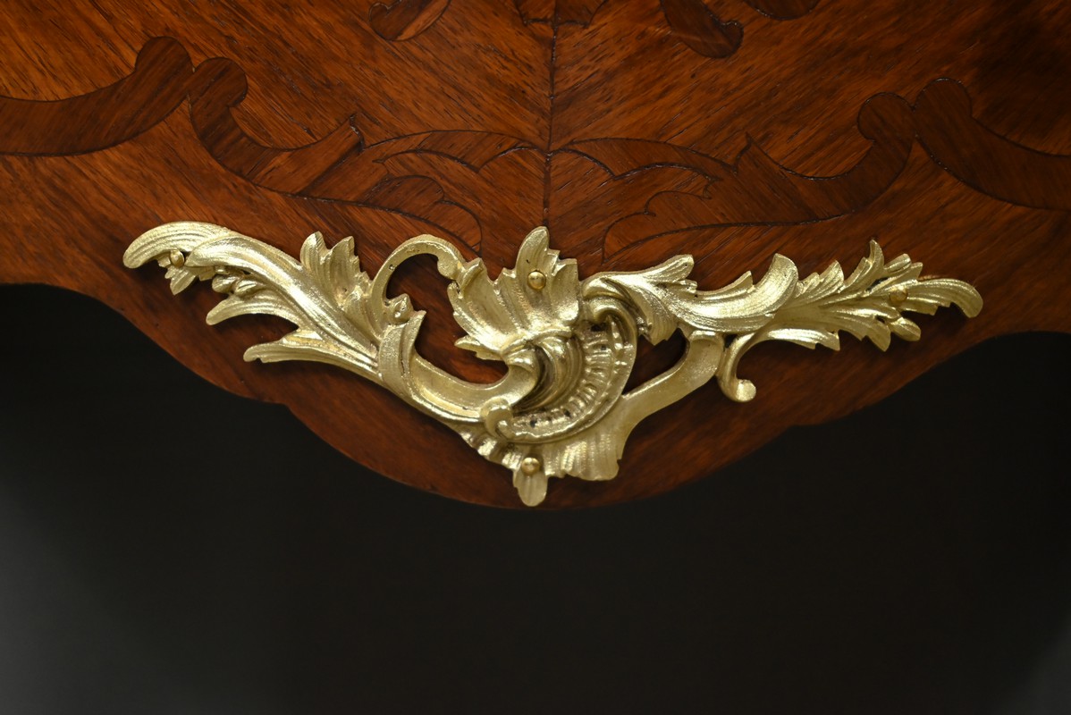Sa forme galbée, typique du style rocaille, est sublimée par des chutes et sabots en bronze finement ciselés, qui soulignent la courbe gracieuse de ses pieds.