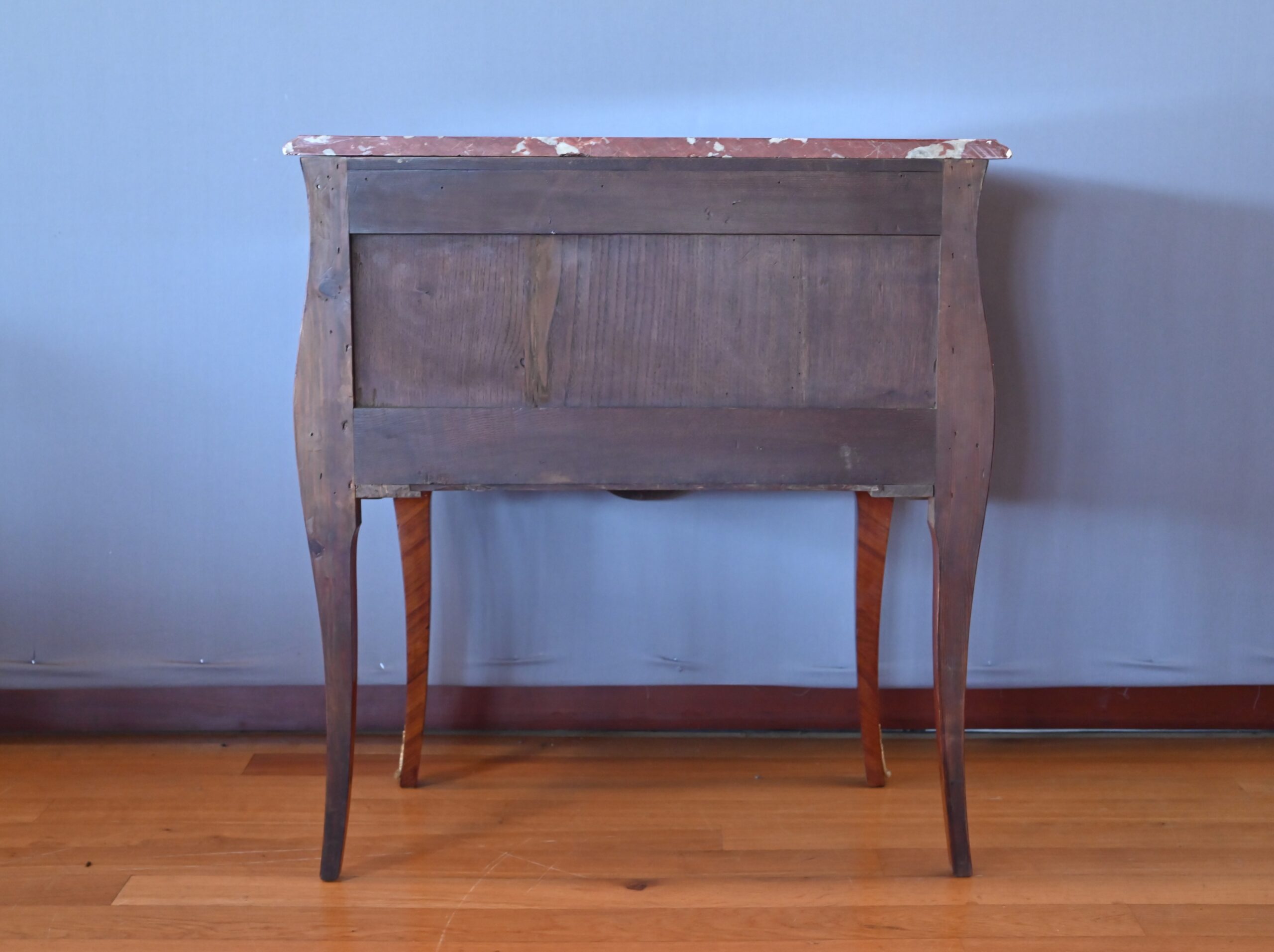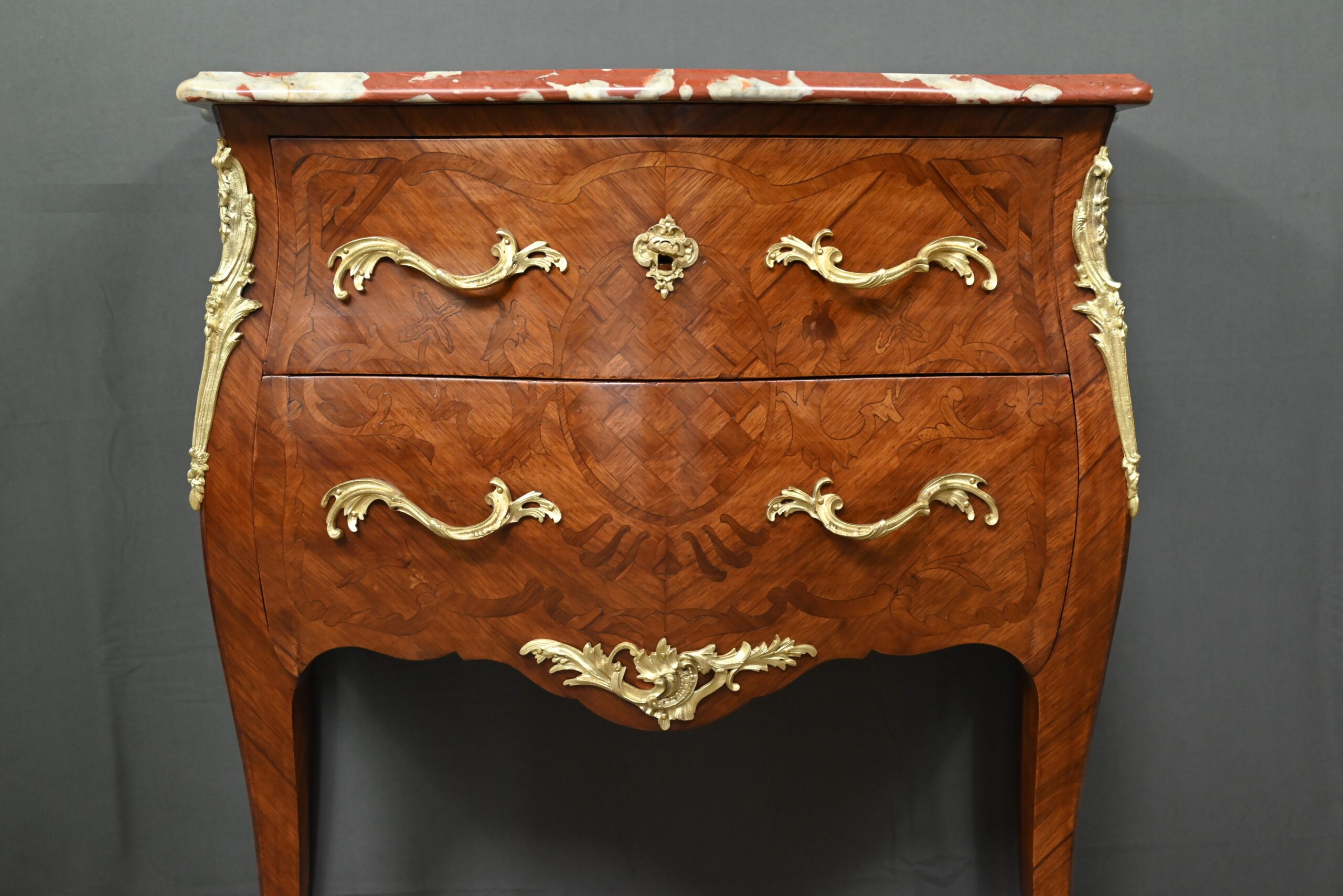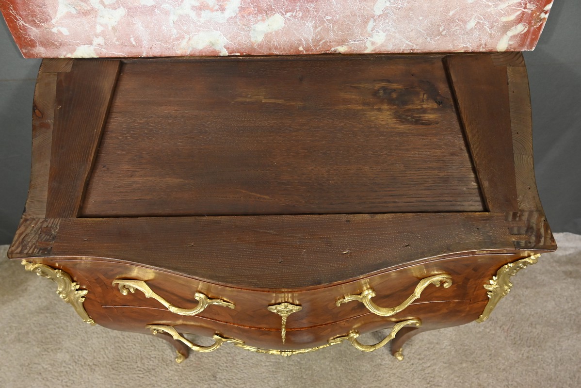 Sa forme galbée, typique du style rocaille, est sublimée par des chutes et sabots en bronze finement ciselés, qui soulignent la courbe gracieuse de ses pieds.