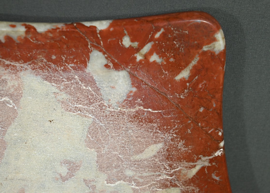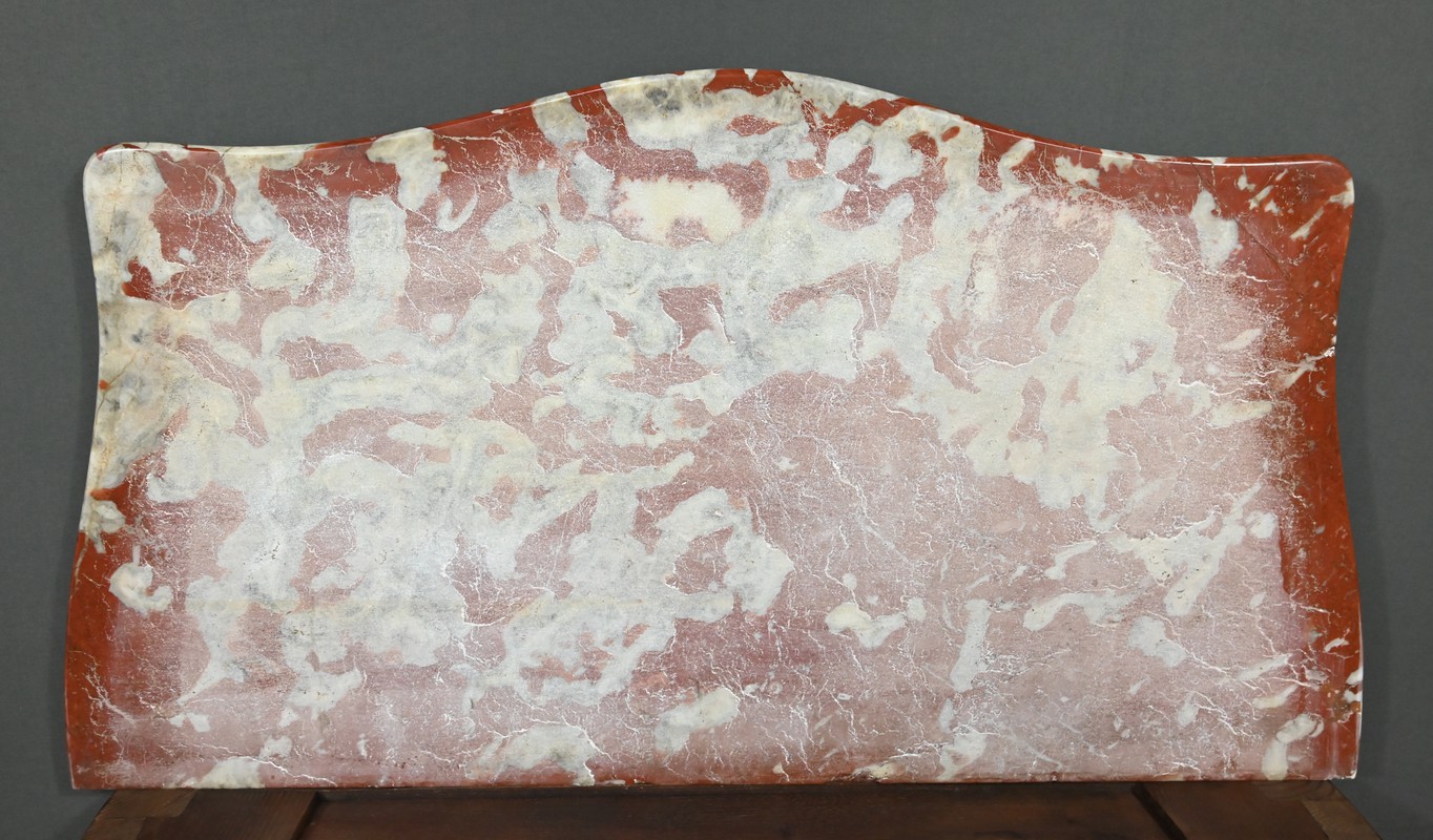 Le cul-de-lampe central, richement sculpté, apporte une note de majesté à l’ensemble, tandis que le plateau en marbre griotte, aux veines blanches contrastées, couronne le meuble avec éclat et noblesse.