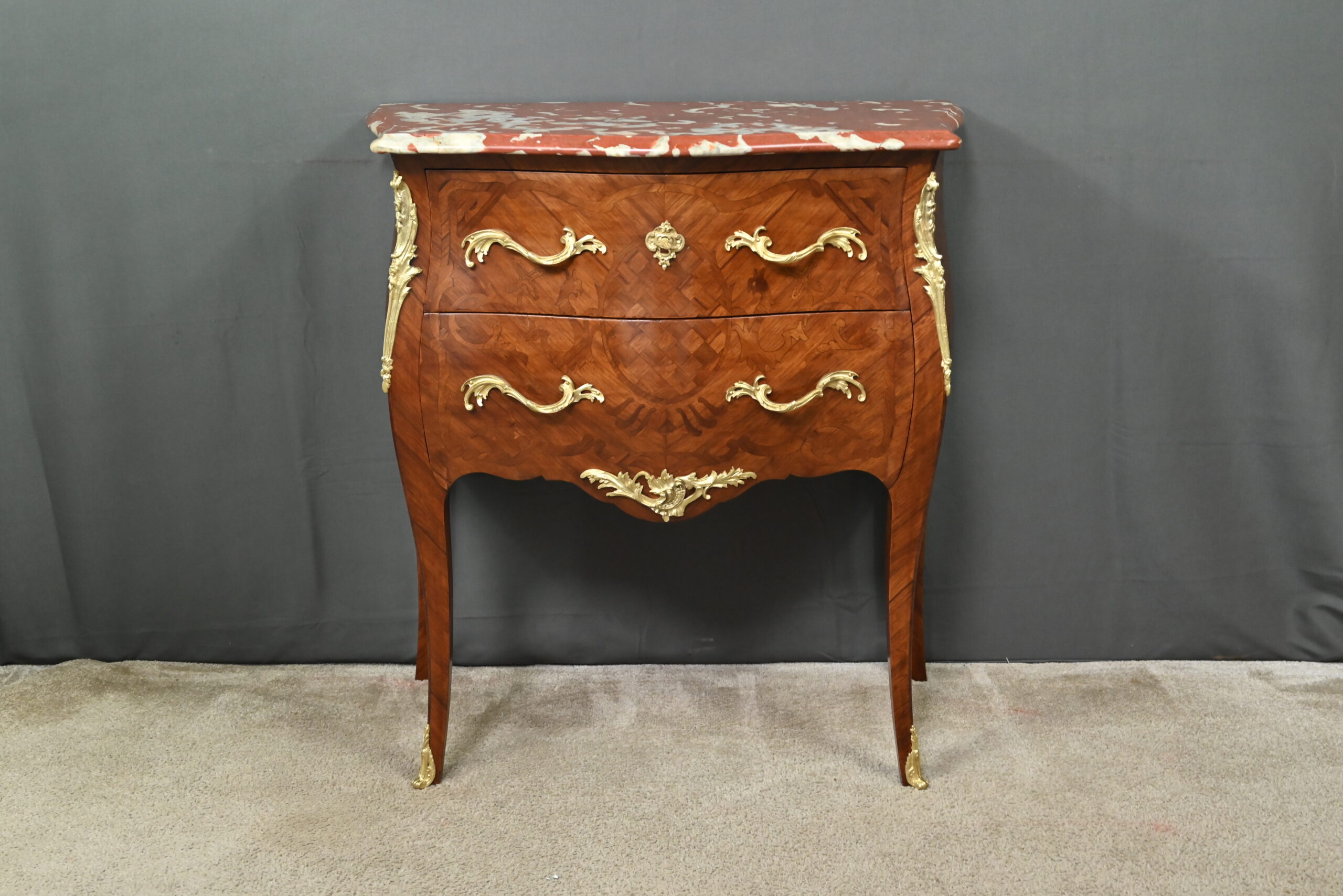 Cette superbe commode marquetée de style Louis XV, réalisée en acajou durant la première moitié du XXe siècle, incarne le raffinement et le savoir-faire de l’ébénisterie française.