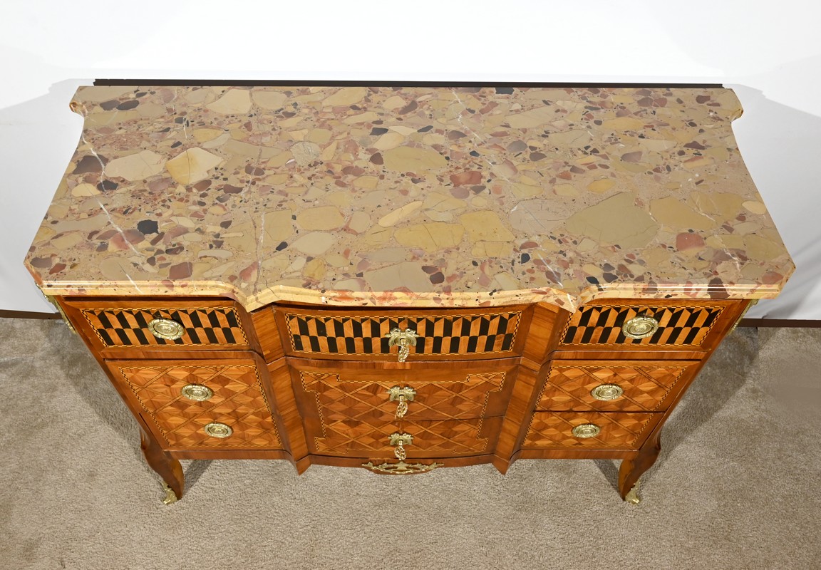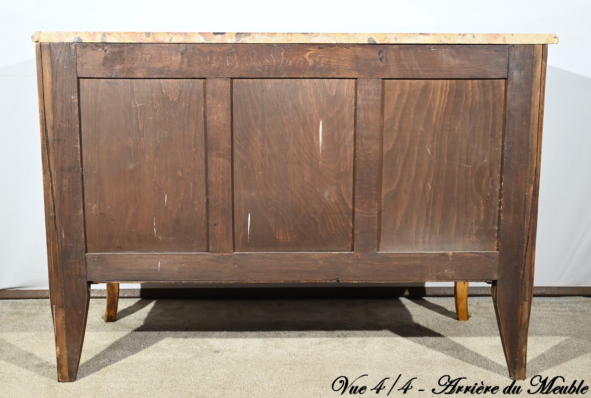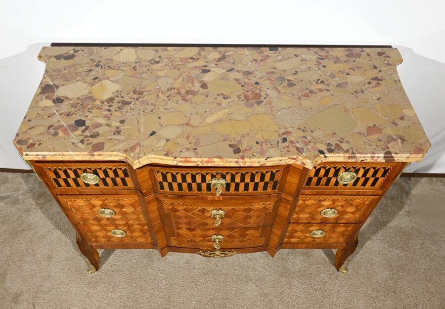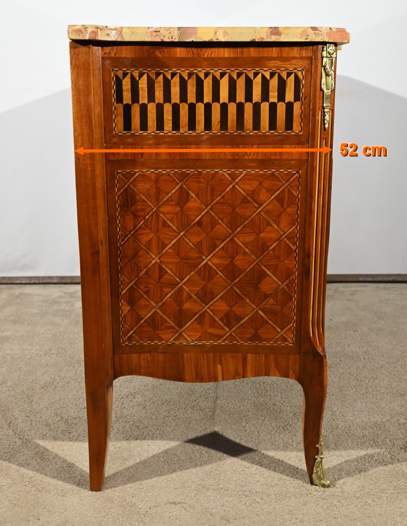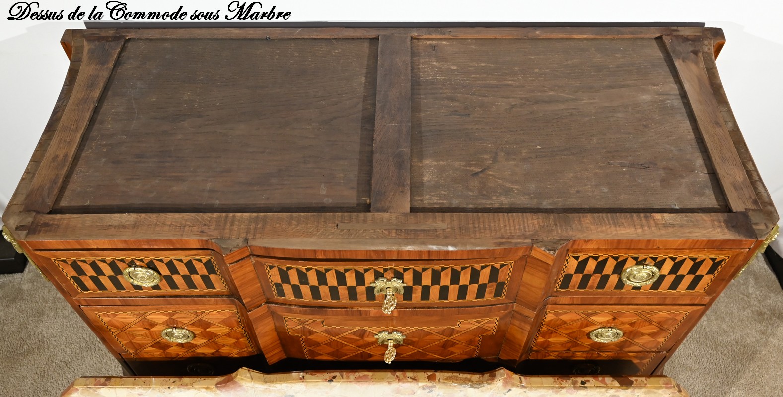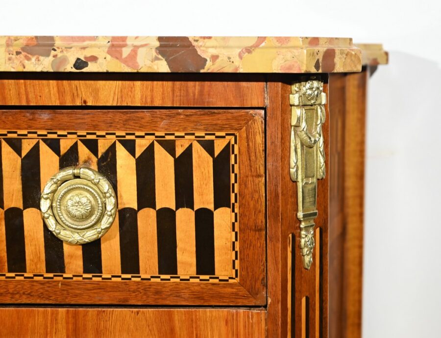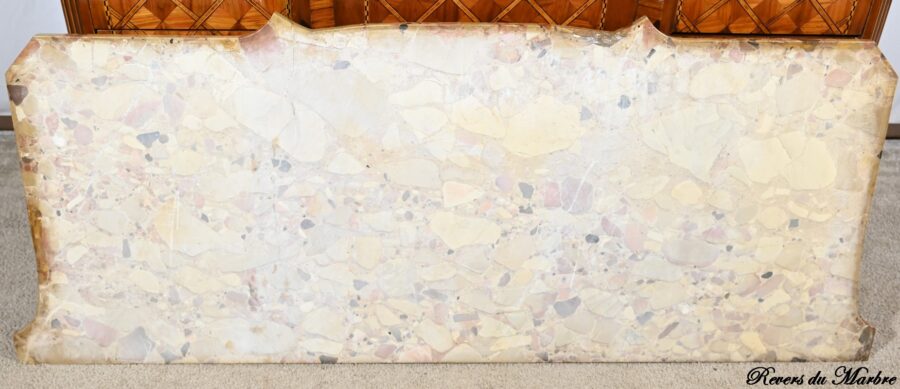Commode à trois tiroirs en placage de bois de rose, d’acajou et de divers bois, coiffé d’un marbre brèche d’Alep.