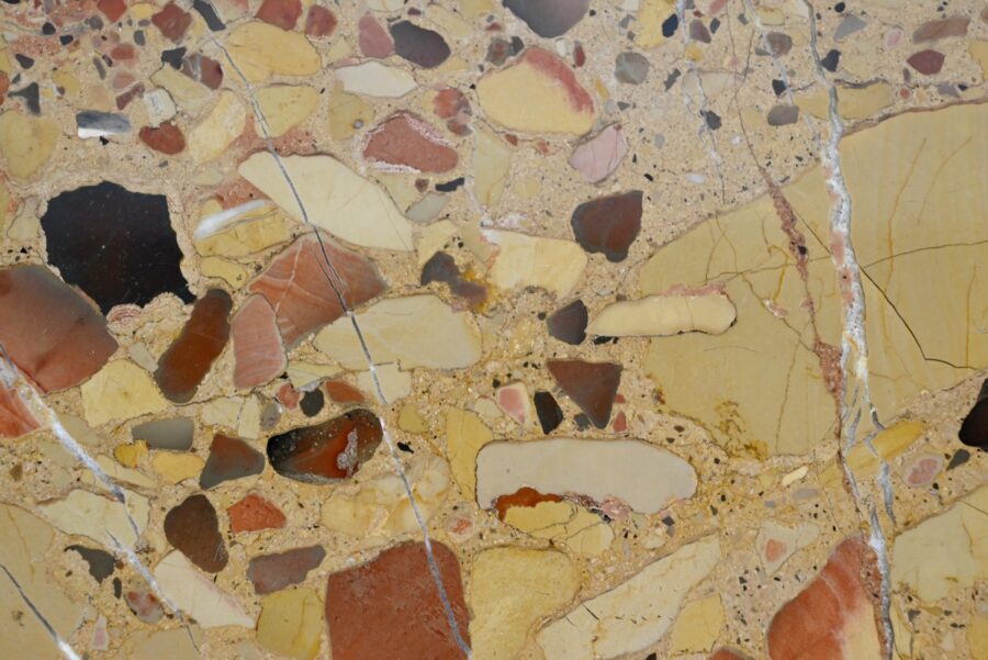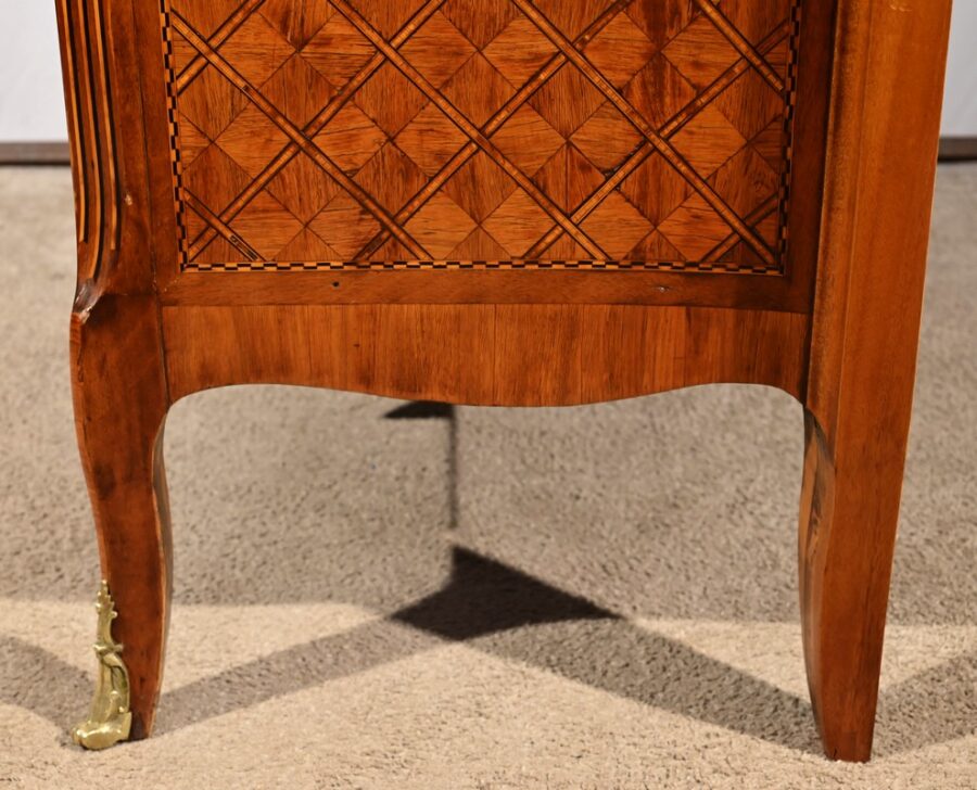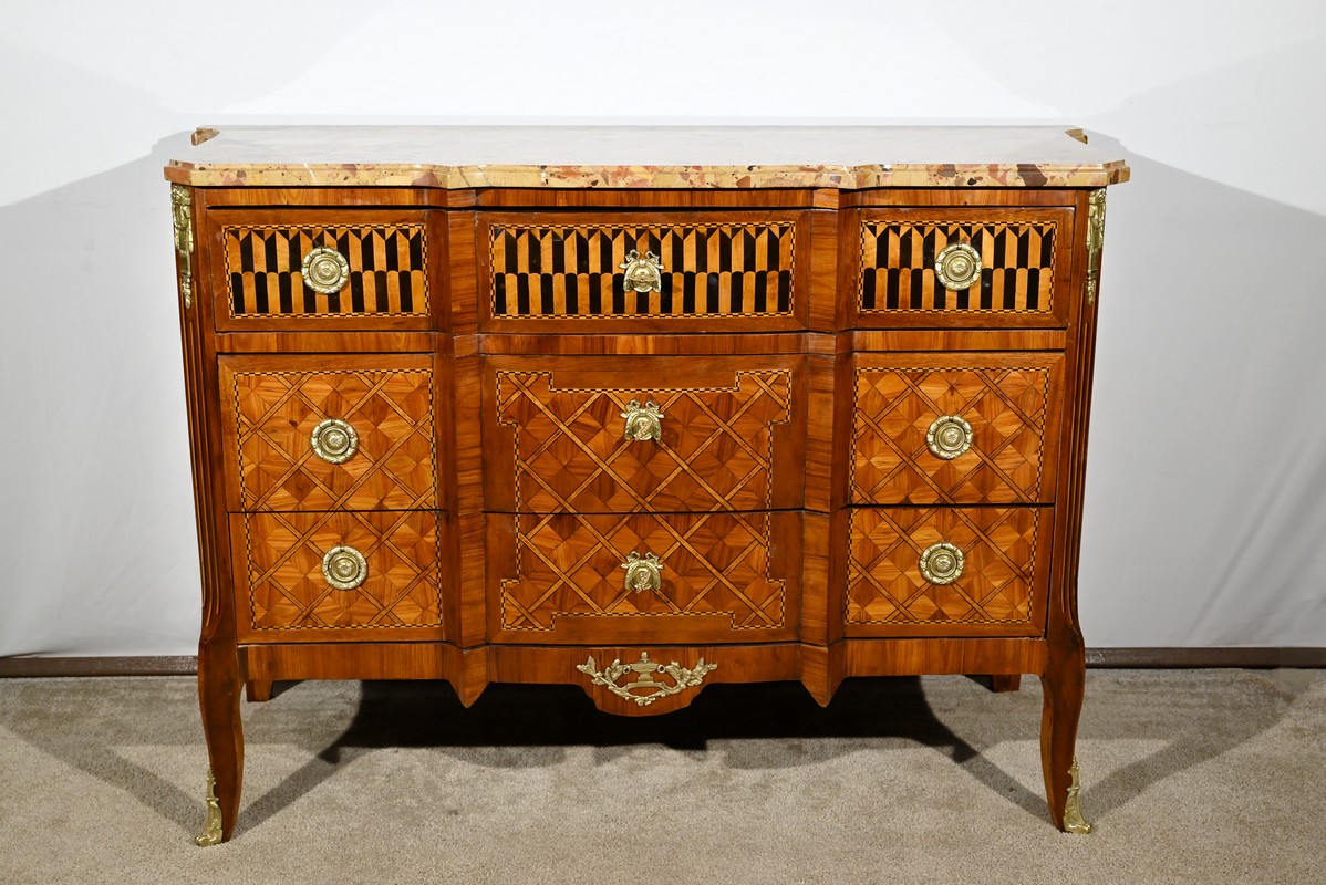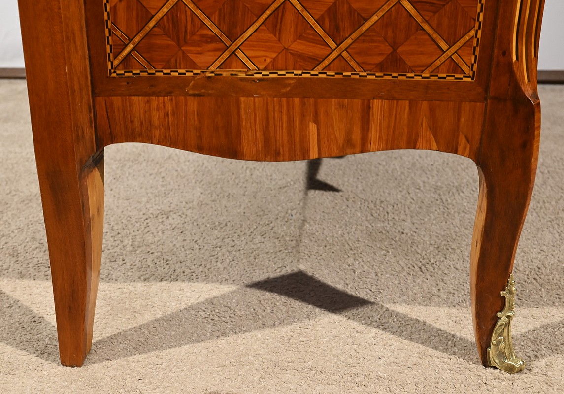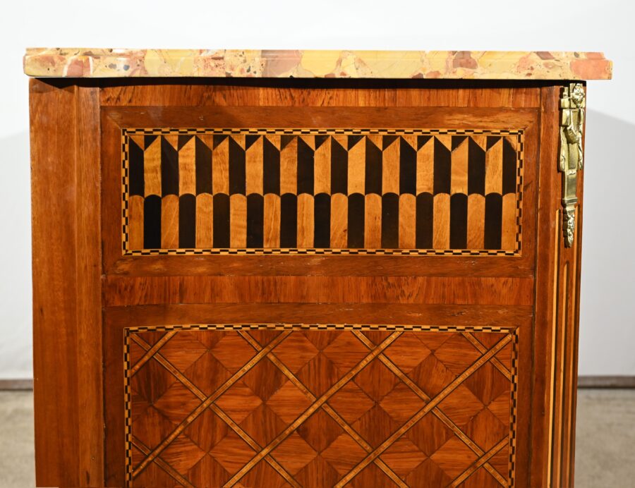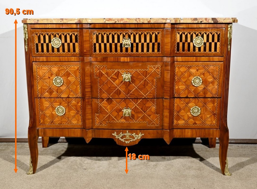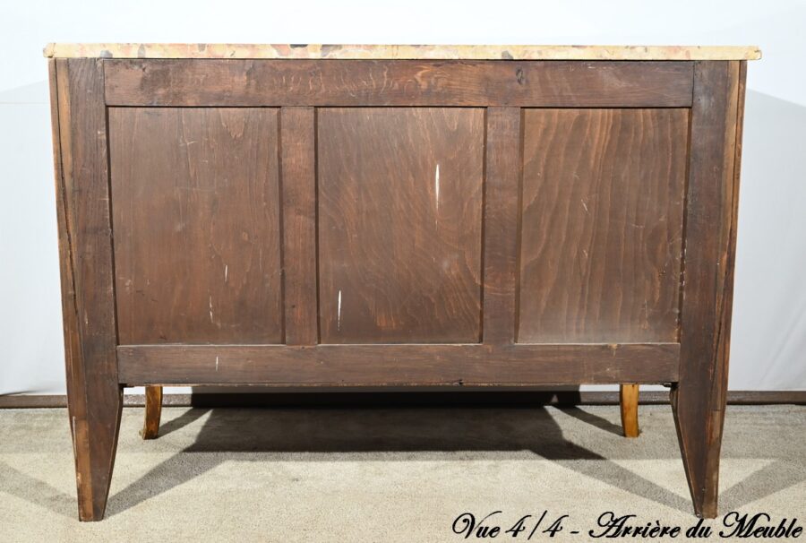 Commode à trois tiroirs en placage de bois de rose, d’acajou et de divers bois, coiffé d’un marbre brèche d’Alep.