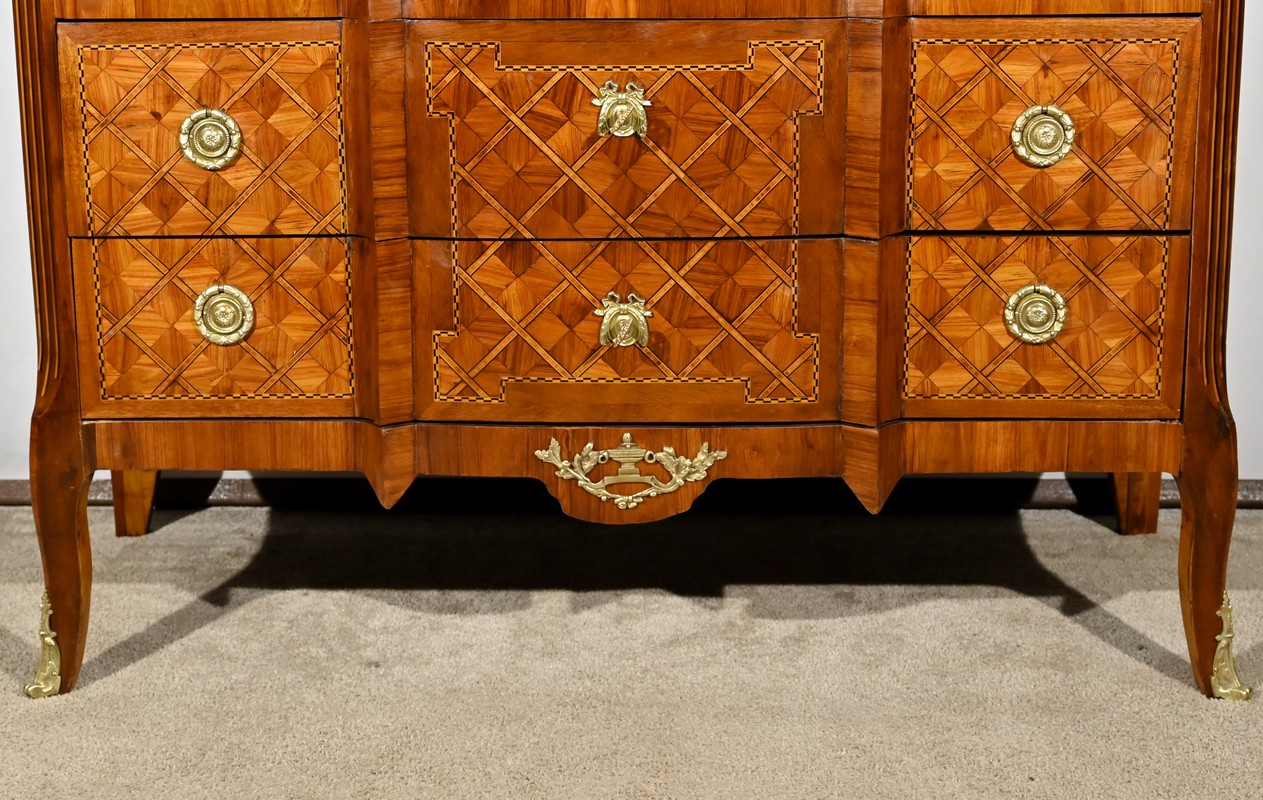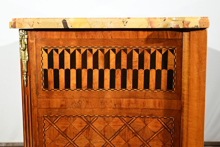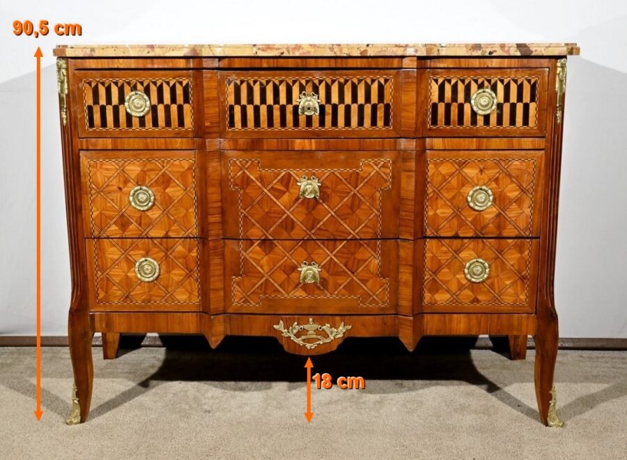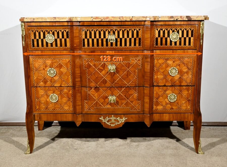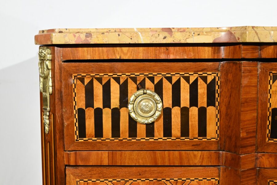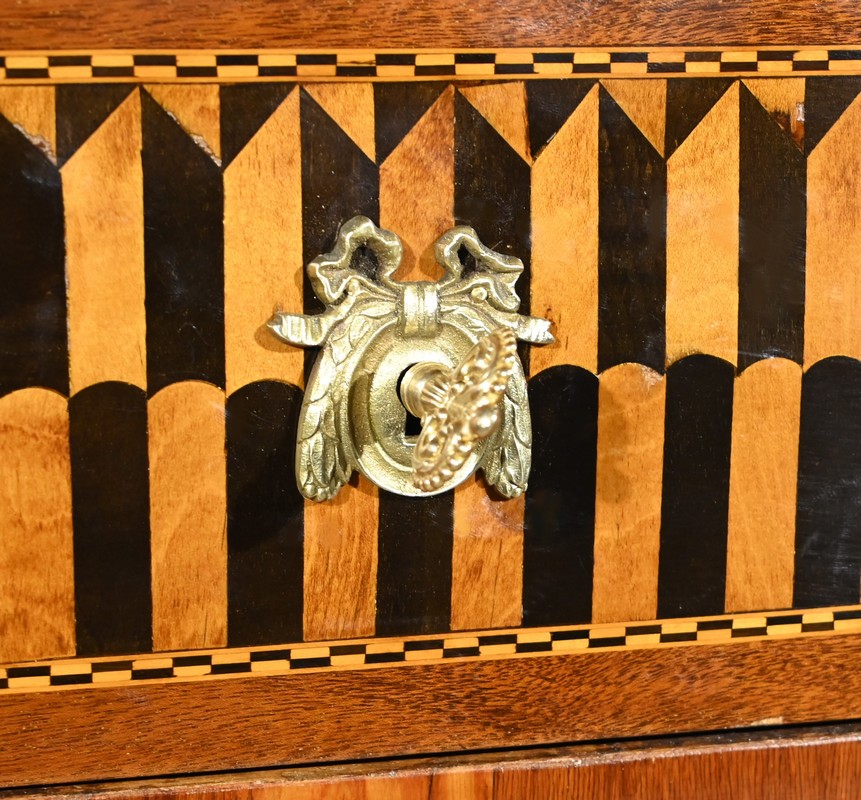 Le deuxième et le troisième tiroir, plus profond, comportent une marqueterie ceinte d’une composition de citronnier et d’ébène avec angles à la grecque. La traverse est cachée permettant une continuité des motifs entre les deux façades.