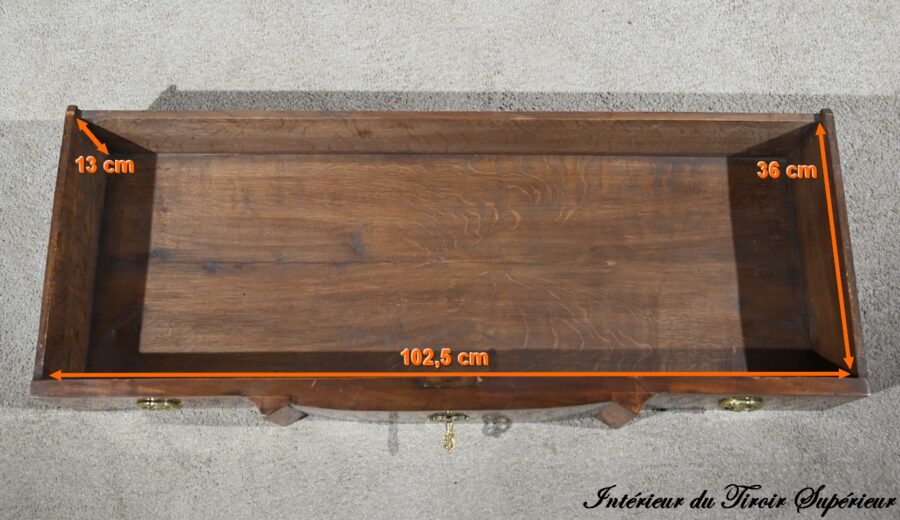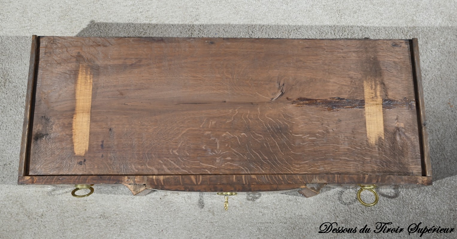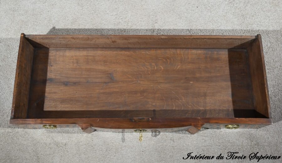 Chaque tiroir est équipé de deux poignées de tirage à anneaux festonnés, de mascarons ciselés d’origine, d’une entrée enrubannée en laiton et d’une serrure authentique fonctionnelle avec clé postérieure.