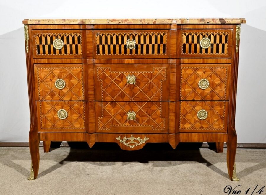 Le premier de ces tiroirs, en partie supérieure, présente une façade à ressaut, à pourtour acajou et marquetée d’une composition de citronnier et d’ébène disposée en quinconce.