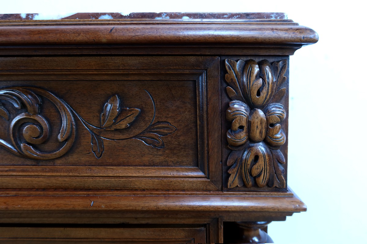 Les façades des tiroirs sont intégralement moulurées de rinceaux et de volutes avec des entrées en bois, ajoutant une touche de sophistication à l’ensemble.