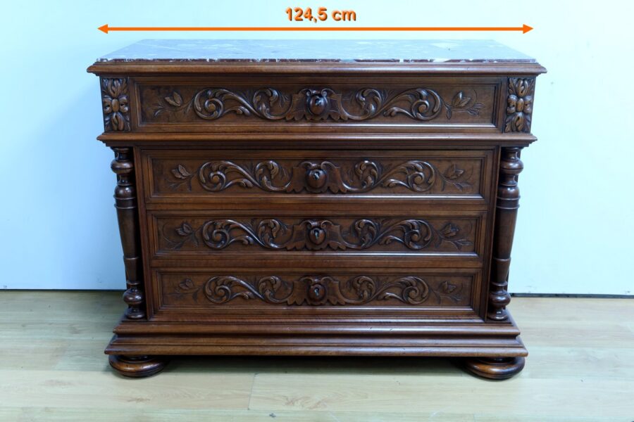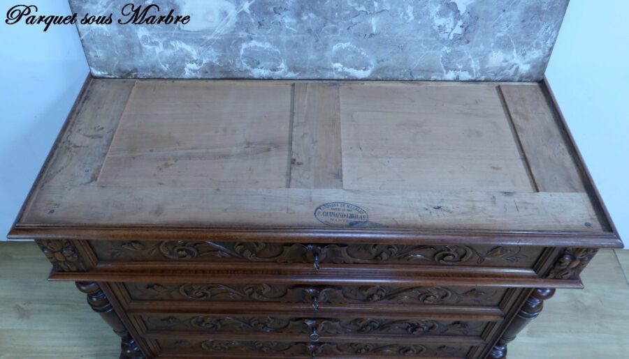 Cette superbe commode en noyer, estampillée par les ébénistes de la maison nantaise P.Guinand-Leglas, est un véritable chef-d’œuvre du style Renaissance.