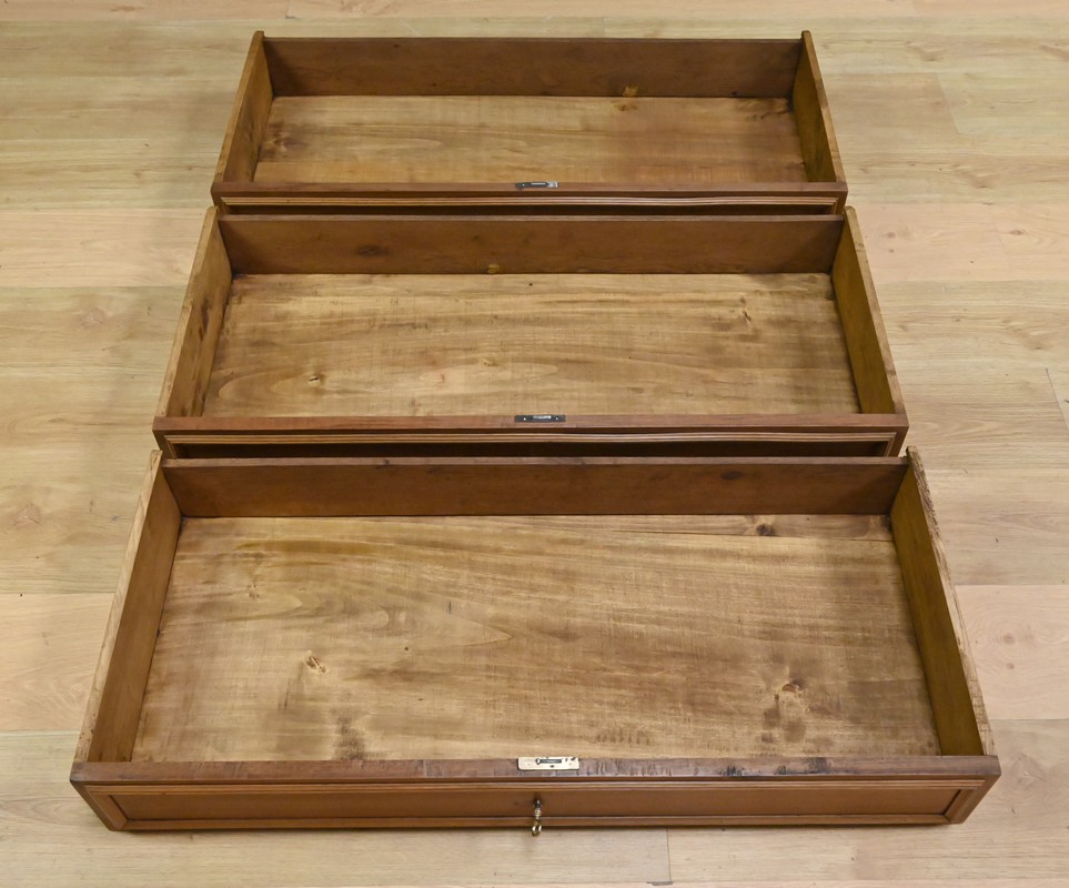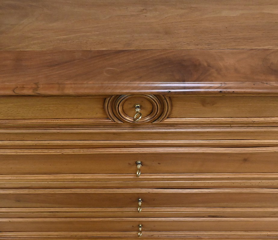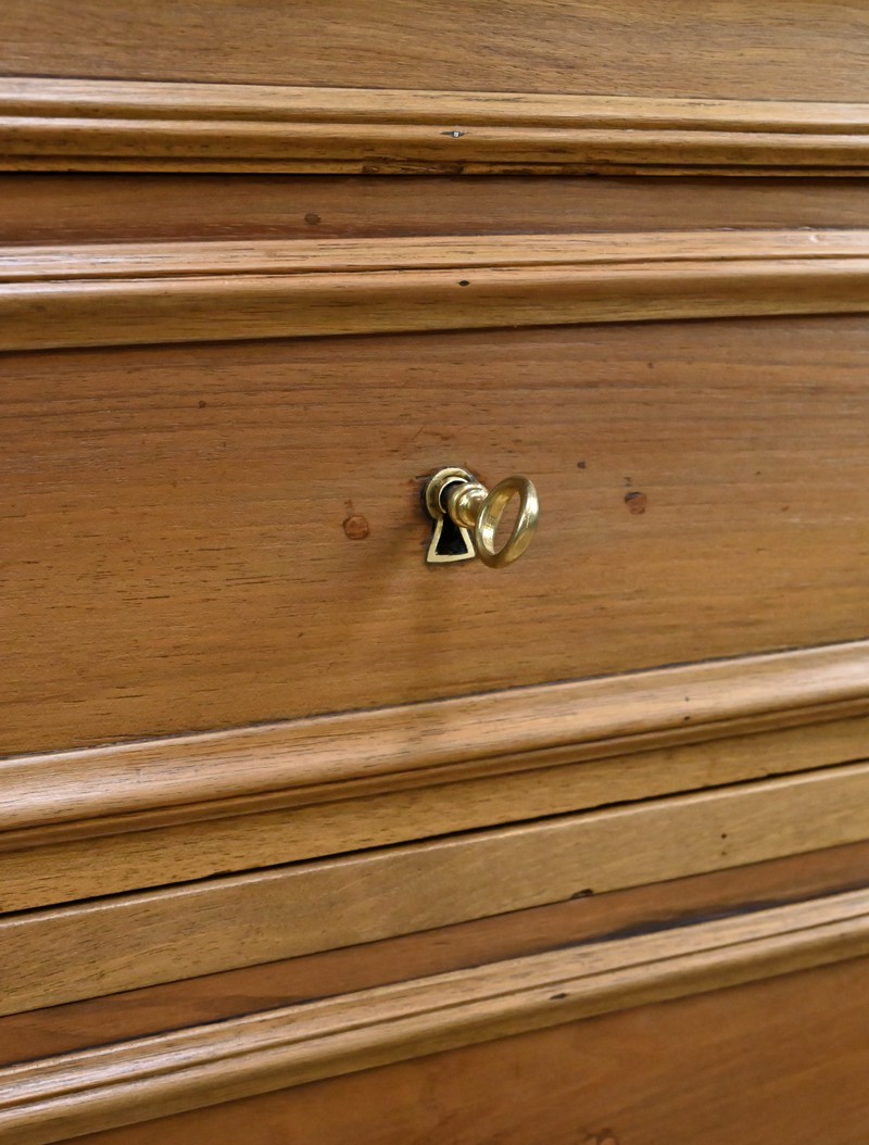 Élégante et parfaitement proportionnée, cette commode en noyer datant des années 1900 séduit par la qualité de son exécution et la sobriété raffinée de son décor. Elle ouvre par quatre tiroirs munis de serrures fonctionnelles, chacun doté d’une entrée de serrure filetée, d’une clé et de moulurations délicates soulignant la façade.