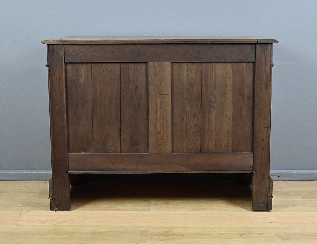 Les montants à pans coupés structurent l’ensemble avec une belle verticalité, tandis qu’une baguette contourne la façade, apportant relief et élégance. Le dessus au contour à doucine renversée témoigne d’un travail soigné, typique de la menuiserie de cette époque.