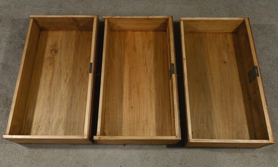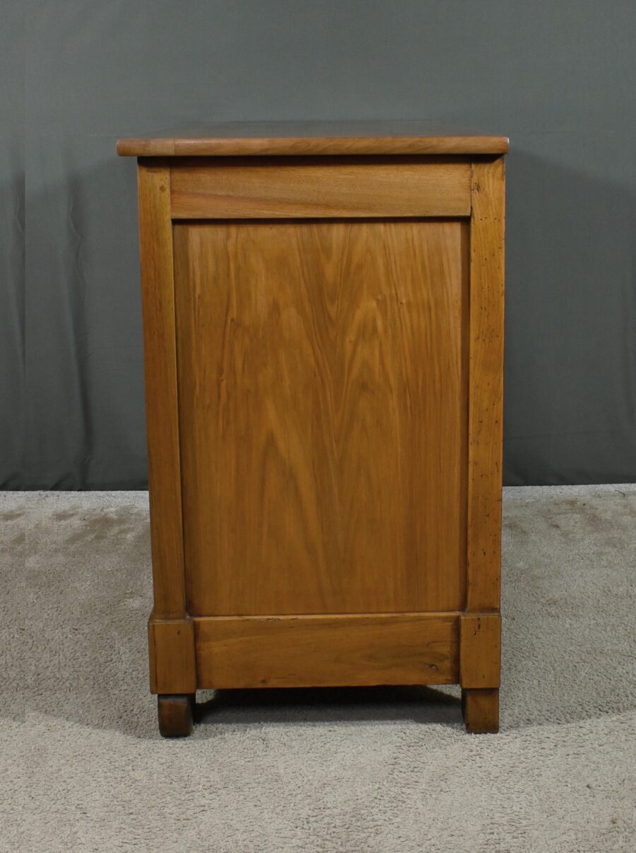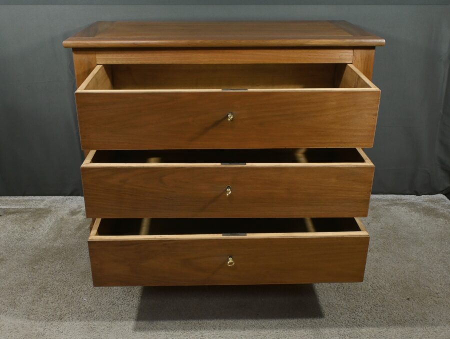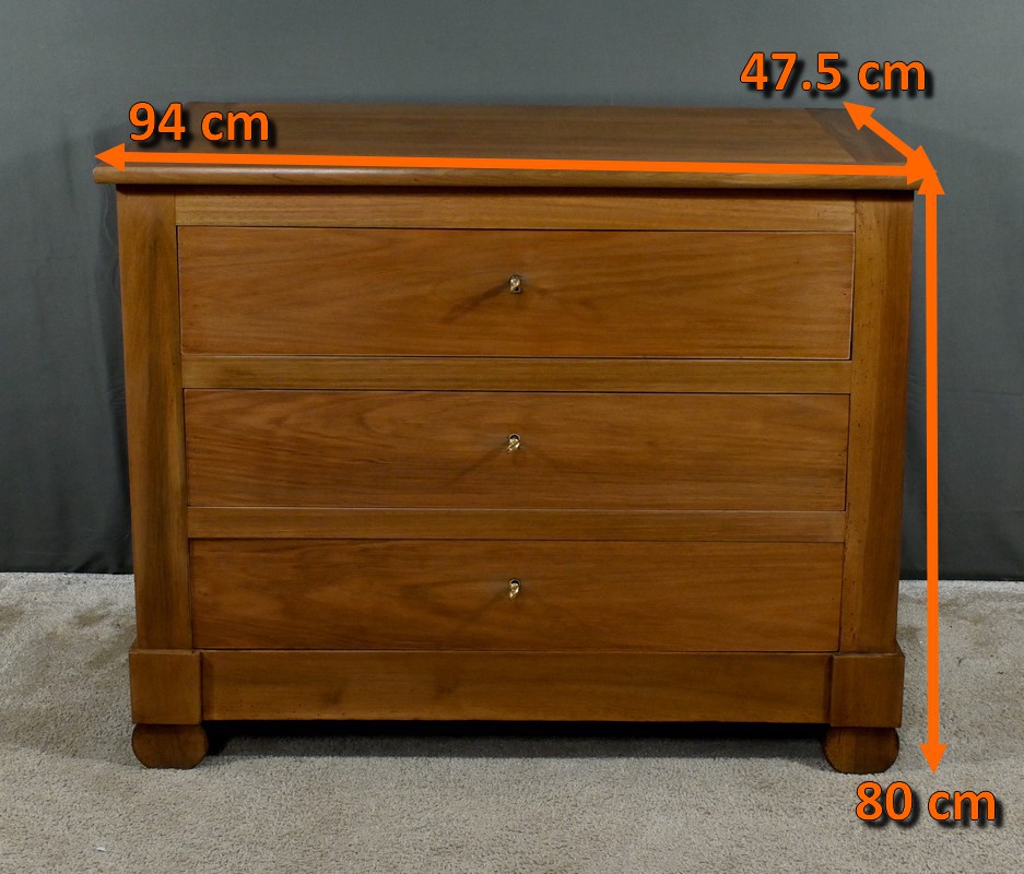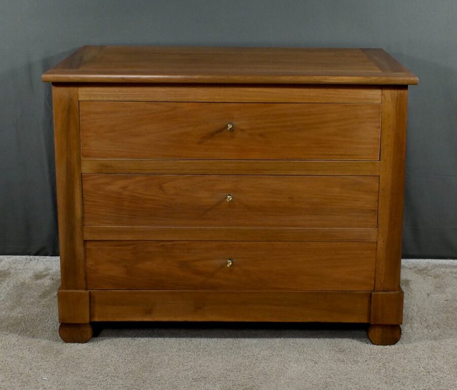 Élégante commode en noyer massif de style Restauration, datant de la fin du XIXe siècle. Ce meuble se distingue par la qualité de son bois et ses lignes épurées. Dotée de trois tiroirs spacieux, chacun muni d’une clé avec entrée laiton et serrure fonctionnelle, cette commode offre un espace de rangement généreux pour vos effets personnels. Elle repose sur des pieds avant en forme de disque. Les lignes épurées de cette commode en font un meuble intemporel qui s’intègre harmonieusement dans tout type de décoration, qu’elle soit traditionnelle ou contemporaine.