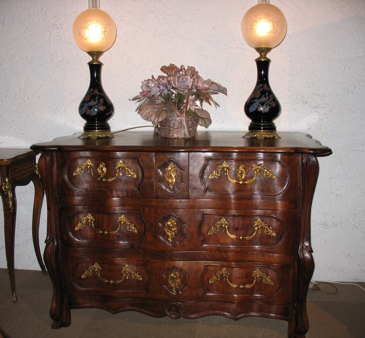 Riche commode Louis XIV/Louis XV en noyer et hêtre de la fin du XVIIIe siècle.