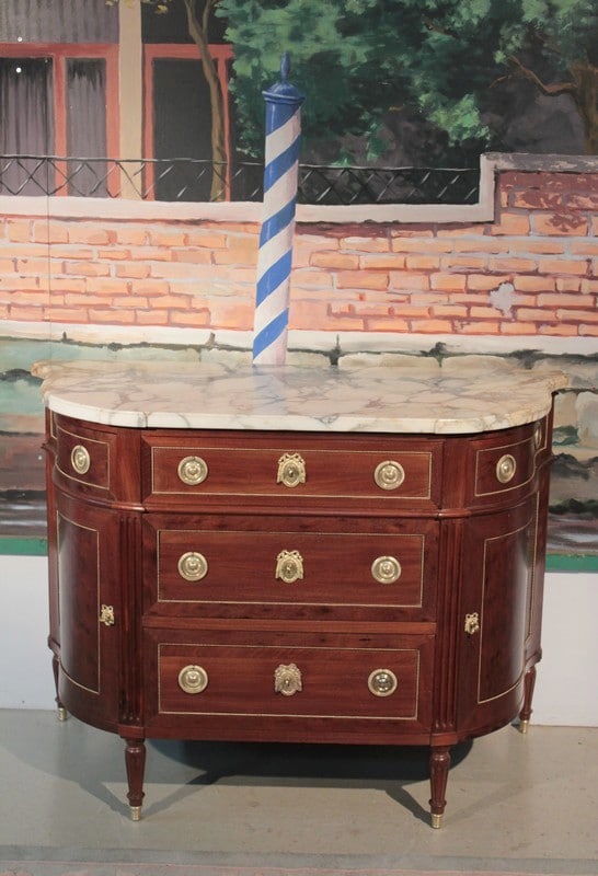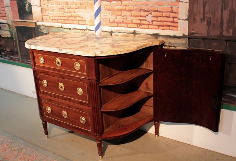 Très belle commode Louis XVI en acajou, dessus bois, ouvrant à 5 tiroirs sur 3 rangs. Pieds à ressaut, garnitures de bronze d’origine. Région de Nantes. Première partie du XIXe.