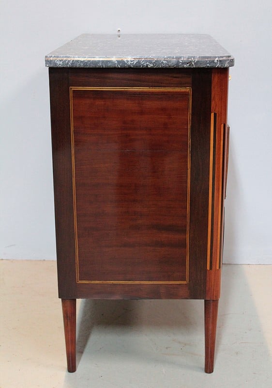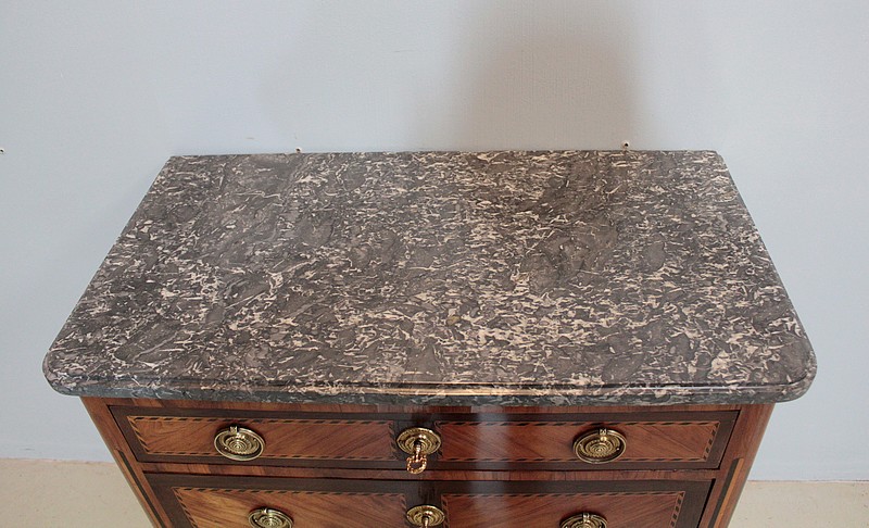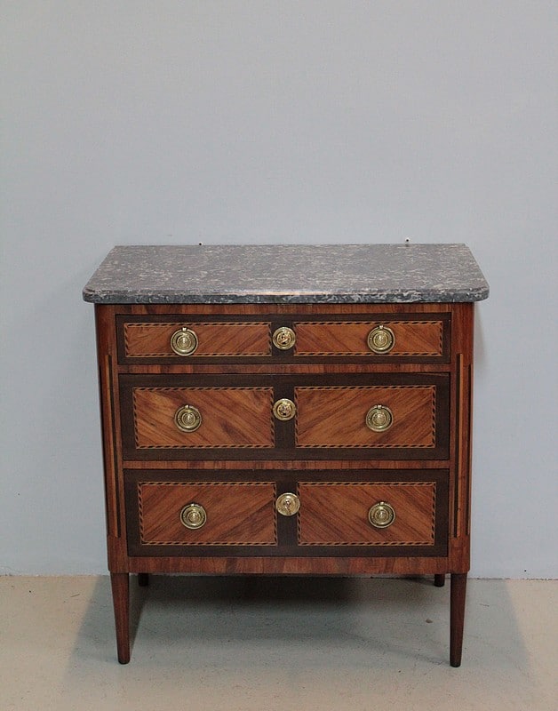 Petite commode Louis XVI d’entre-deux en placage de bois de rose et d’amarante ouvrant par 3 tiroirs.