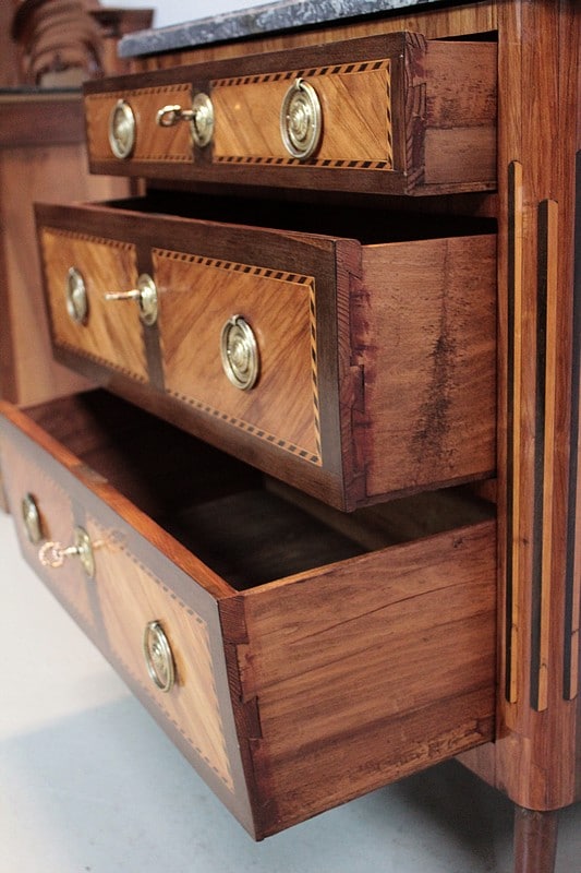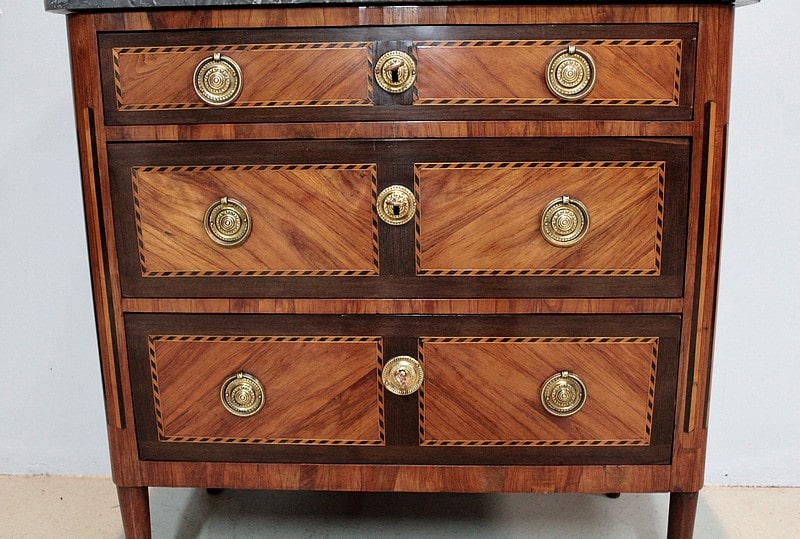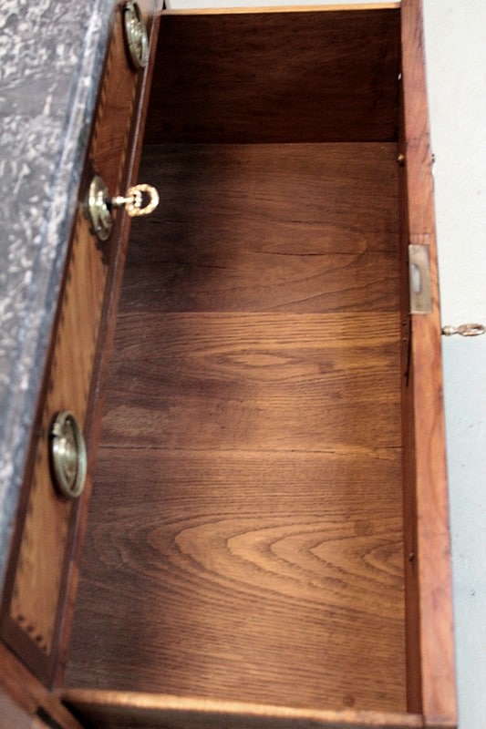 Très bon état après restauration. Finition vernie. Entrée de serrure du 3e tiroir différente. Bon fonctionnement des clés.