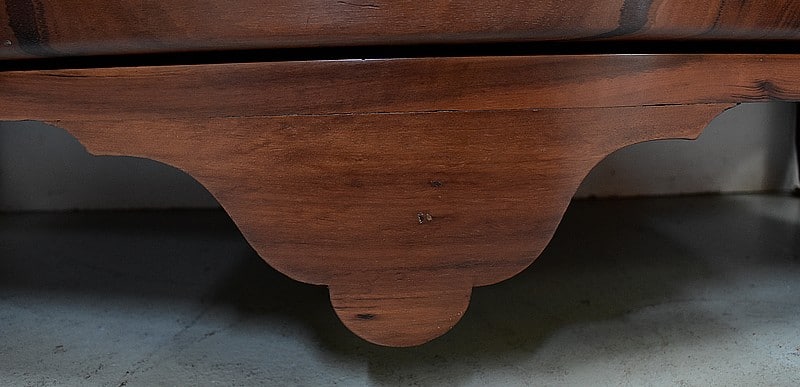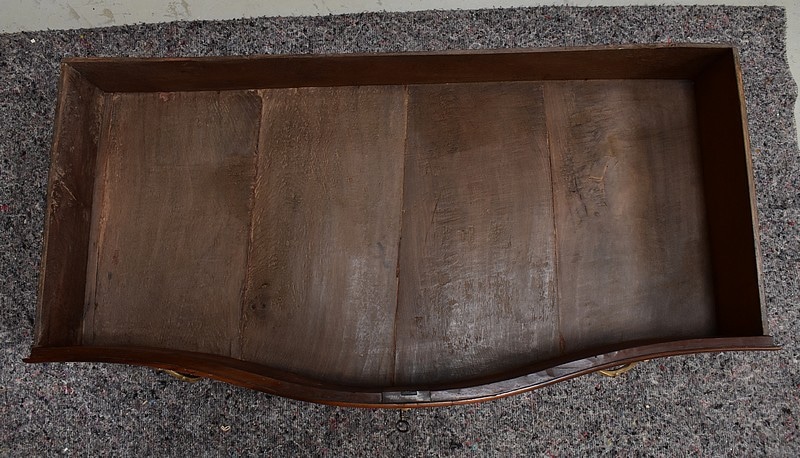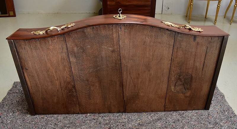 A noter également le galbe prononcé de la devanture, qui donne une grâce générale à cette commode. Les ossatures des façades des 3 grands tiroirs qui la composent sont constituées de pièces de bois d’un seul tenant, délignées dans leurs longueurs, ce qui a demandé pour l’époque une technicité étonnante.