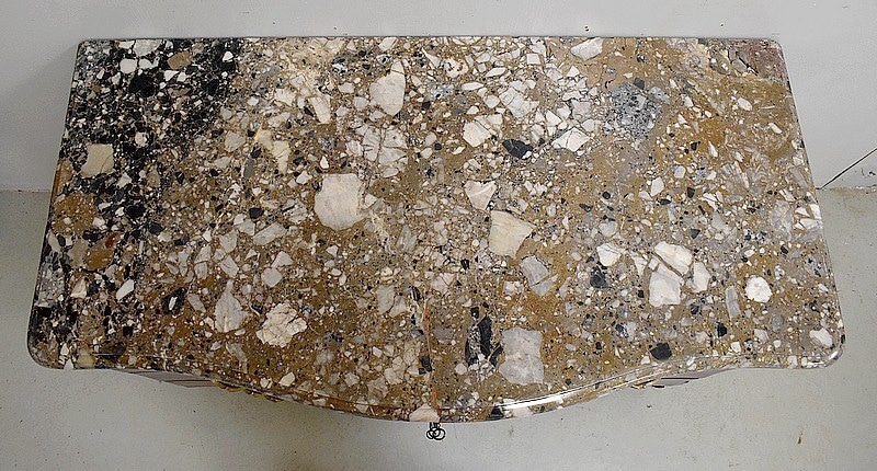 Un marbre ‘Brèche de Lourdes’ enjolive littéralement cette commode, par sa singularité et ses teintes surtout, mais aussi par son pourtour mouluré en ‘Bec de Corbin’. Le devant de ce marbre est découpé en arrondi, afin d’épouser les lignes de la façade du meuble, tandis que l’aspect de son chant arrière témoigne de son authenticité.