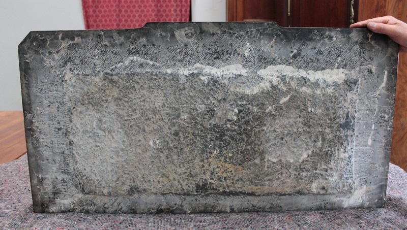Son dessus est en marbre Portor – noir aux veinules ocre, ce marbre rare est exploité en Italie (sur le côte de Gênes) depuis l’antiquité, et réservé aux meubles les plus somptueux –