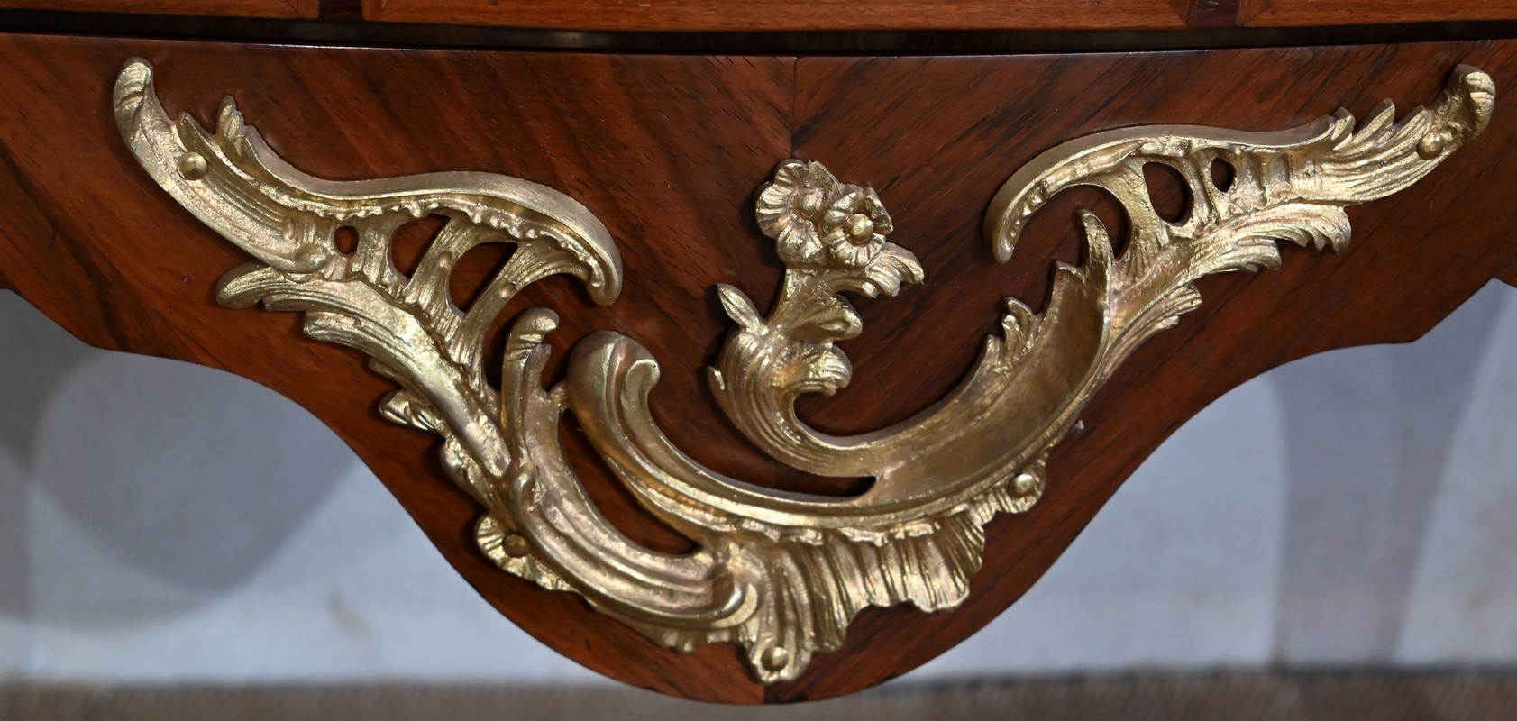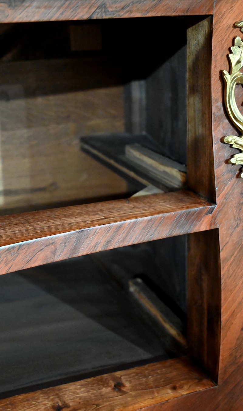 Les traverses sont en placage de palissandre de Rio, et celle du bas est ornée d’un important bronze ajouré, avec feuillages et fleurs.