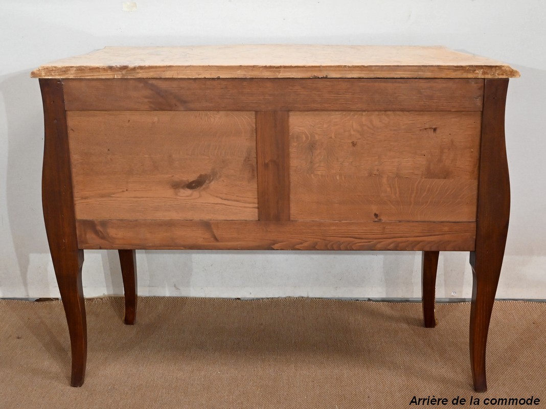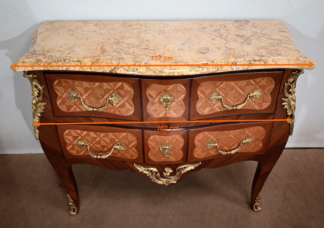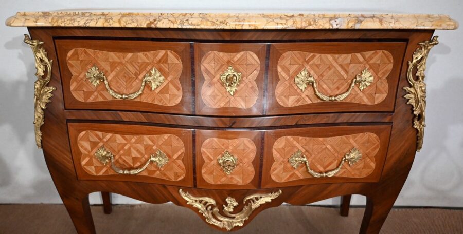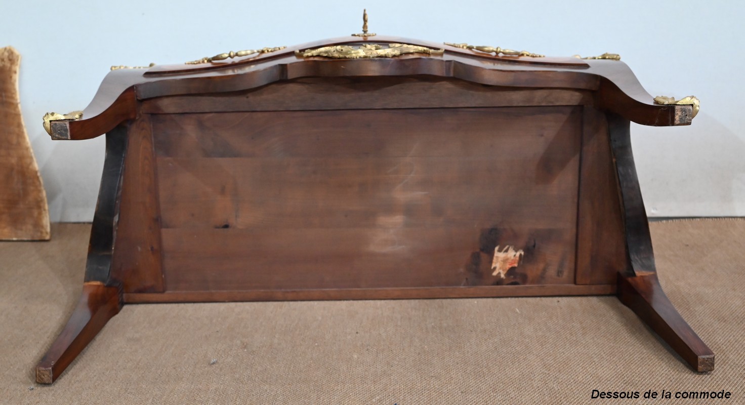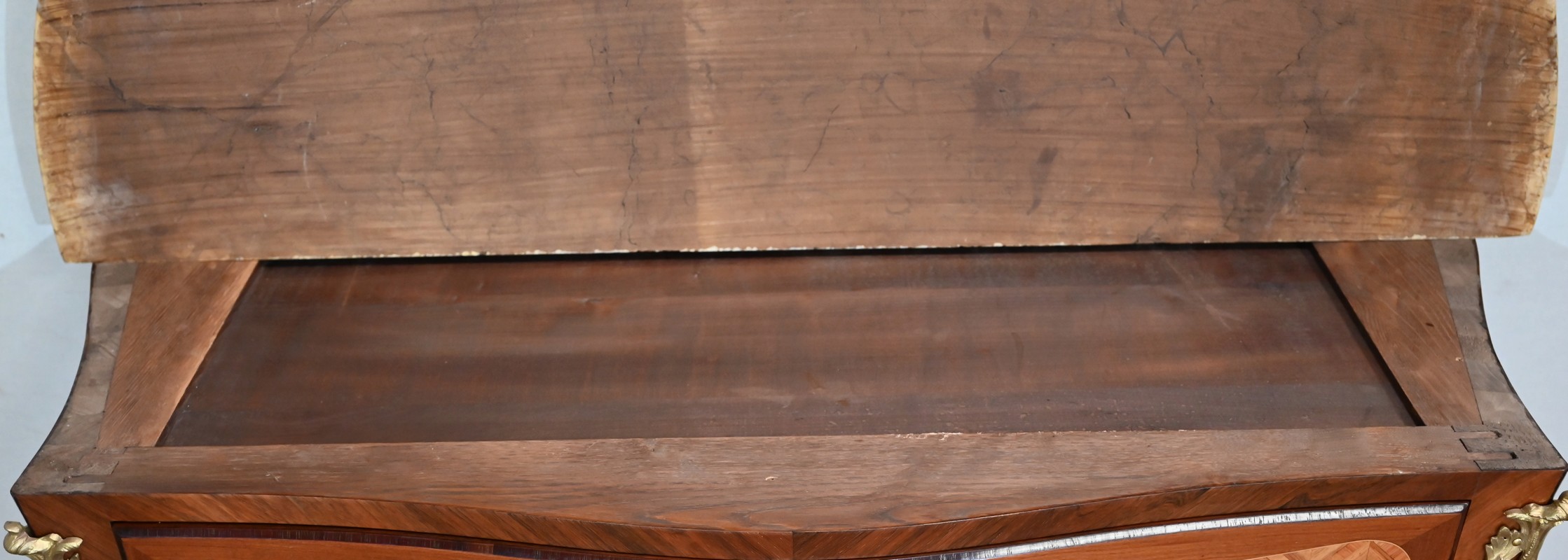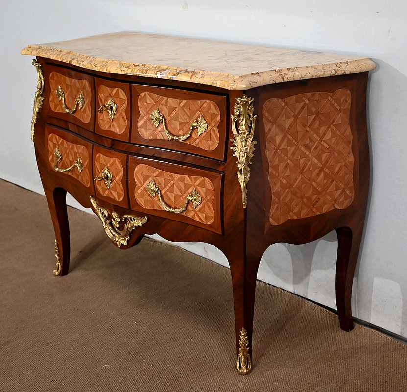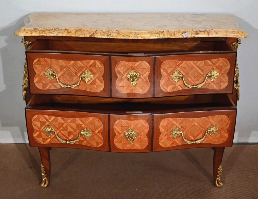 Le dessus, dans un épais marbre brocatelle jaune du Jura, mouluré en gorge et à doucine, épouse parfaitement les lignes de la commode.