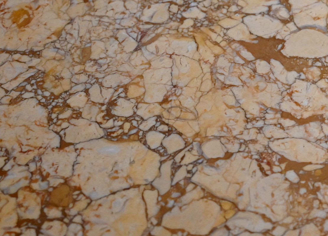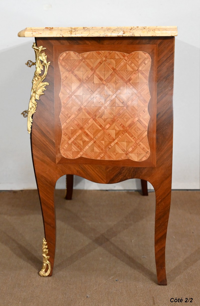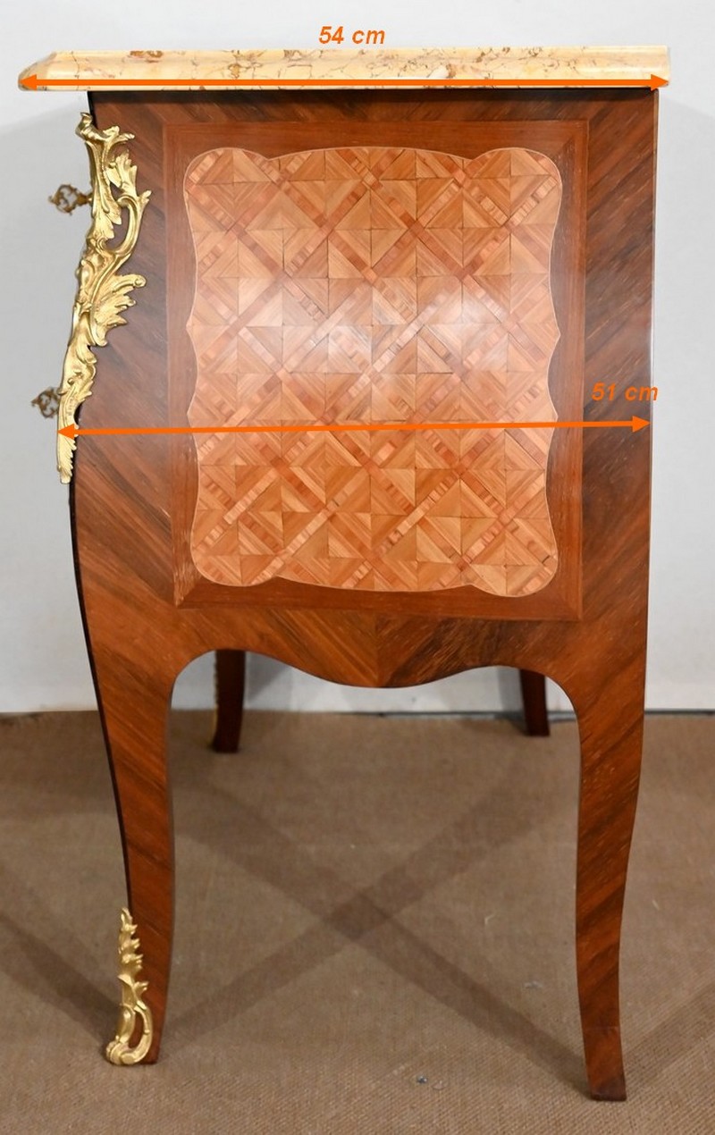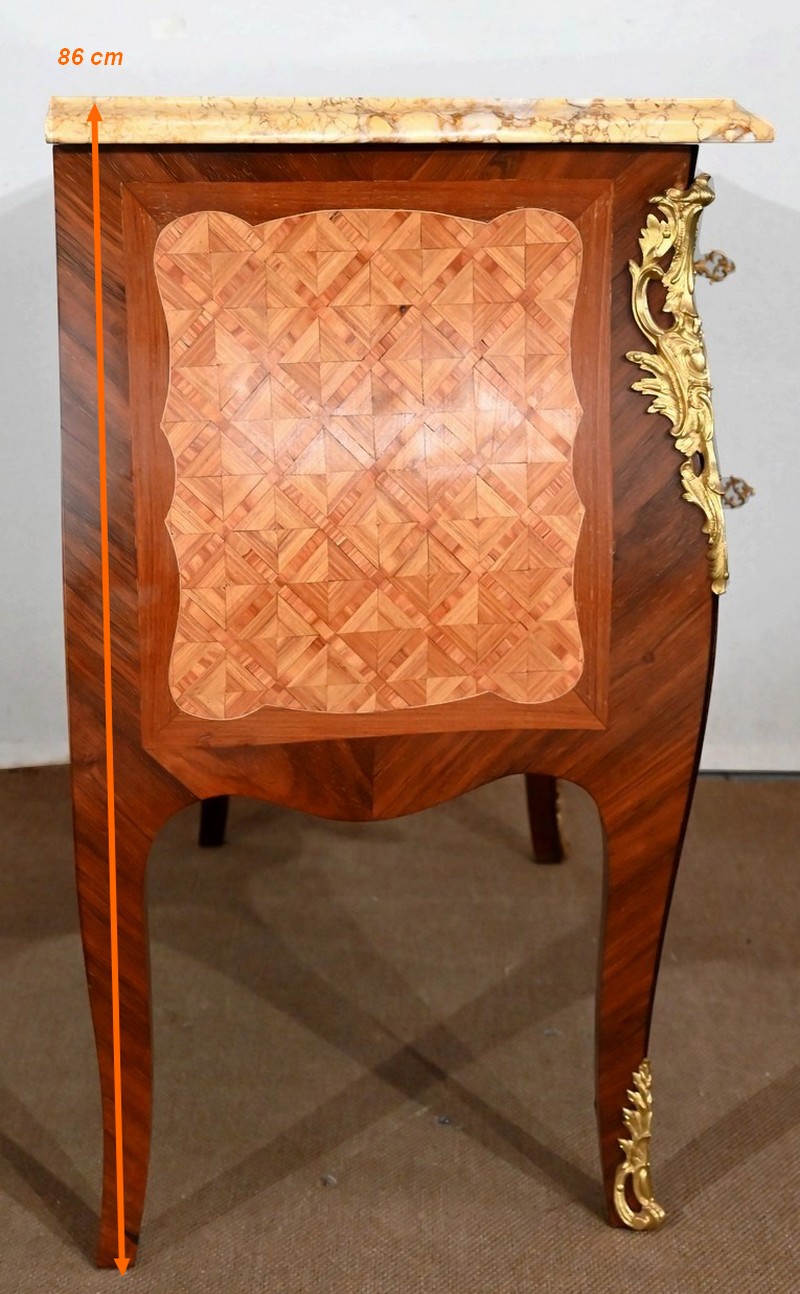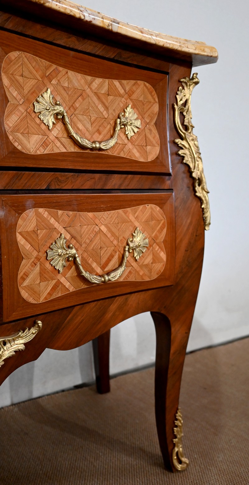 Le dessus, dans un épais marbre brocatelle jaune du Jura, mouluré en gorge et à doucine, épouse parfaitement les lignes de la commode.
