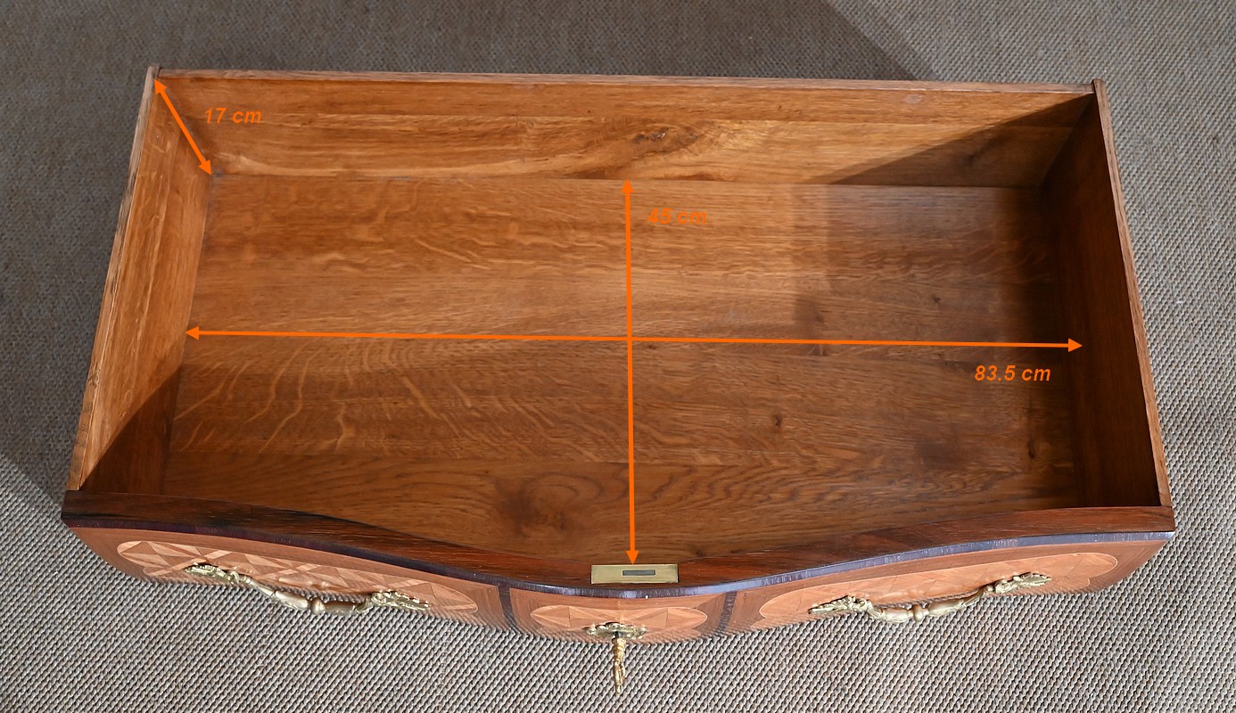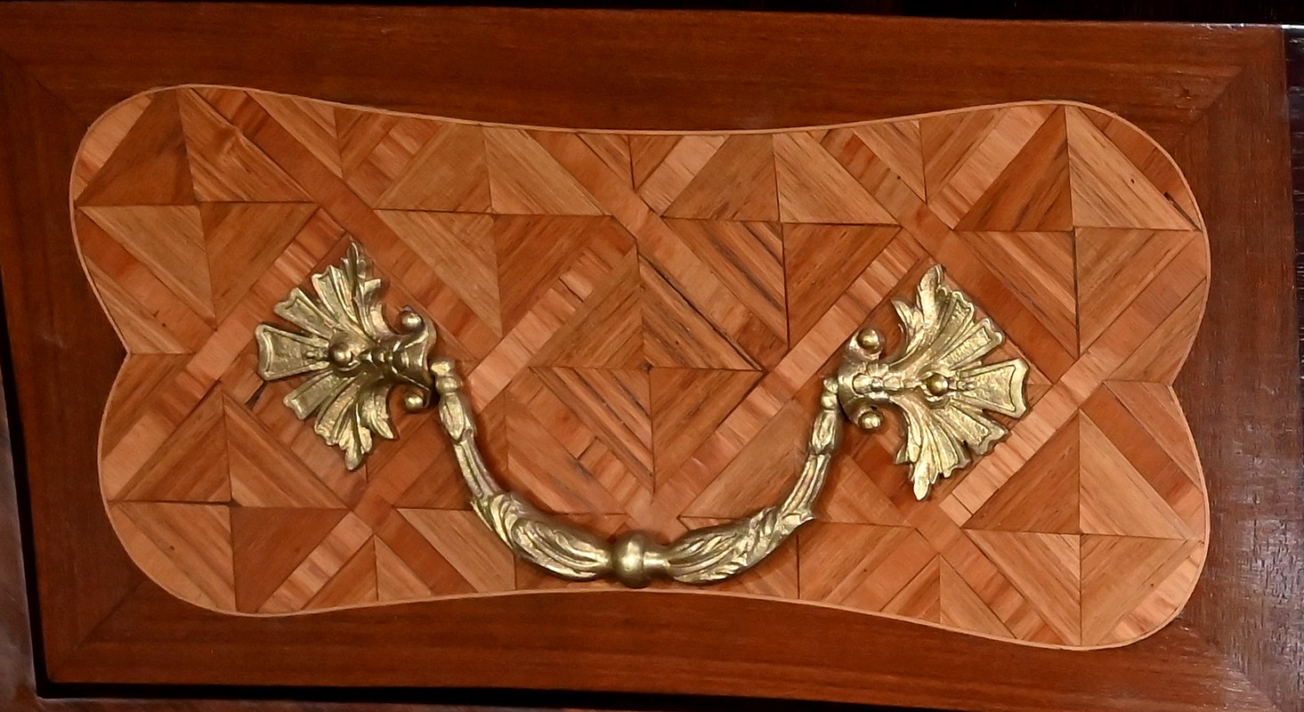 Cette commode à mouvements, ventrue en façade et sur les côtés, ouvre par deux tiroirs. Leurs marqueteries en bois de rose forment des damiers entourés de filets de citronnier, aux pourtours en acajou. Les chanfreins des tiroirs sont en palissandre de Rio. Ils sont pourvus de poignées de tirage tombantes et d’une entrée centrale en bronze, avec clefs et serrures d’origine fonctionnelles.