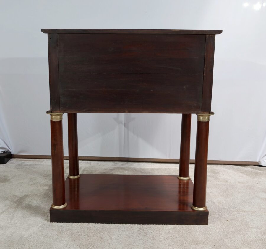 Ce bloc est soutenu sur quatre colonnes cylindriques en placage de ronce d’acajou s’élargissant vers le bas. Ces colonnes sont agrémentées d’une bague en bronze aux ornementations minutieuses en partie haute et d’une collerette ciselée en partie basse. L’ensemble repose sur une base avec une socle plein.