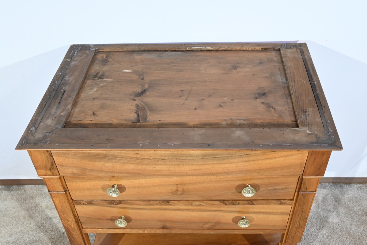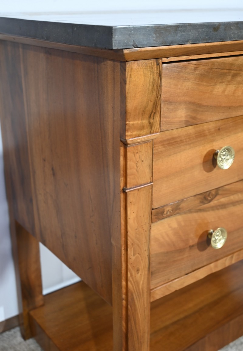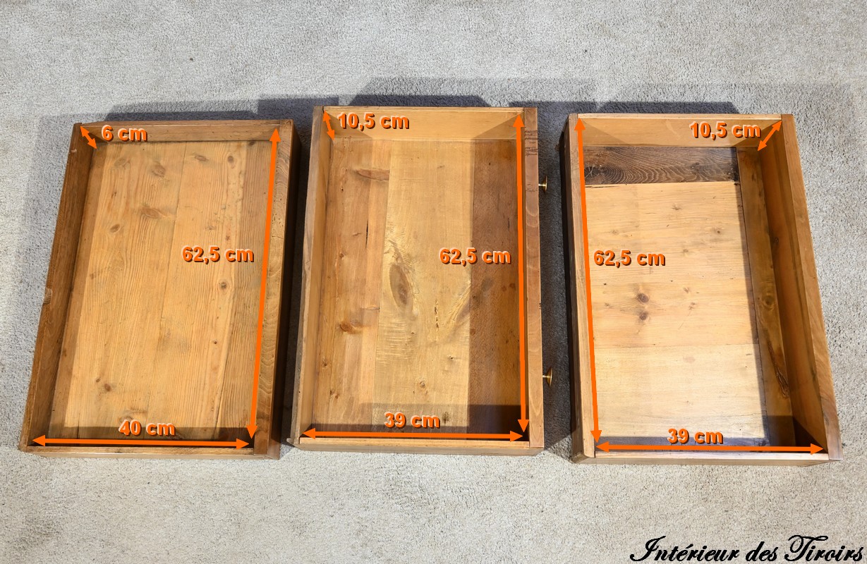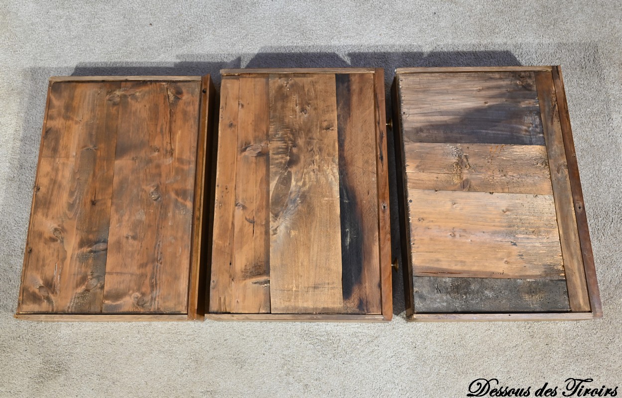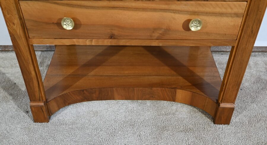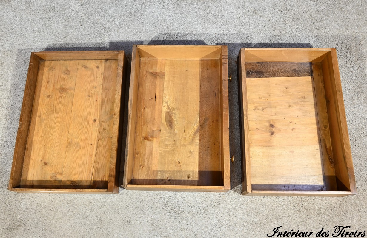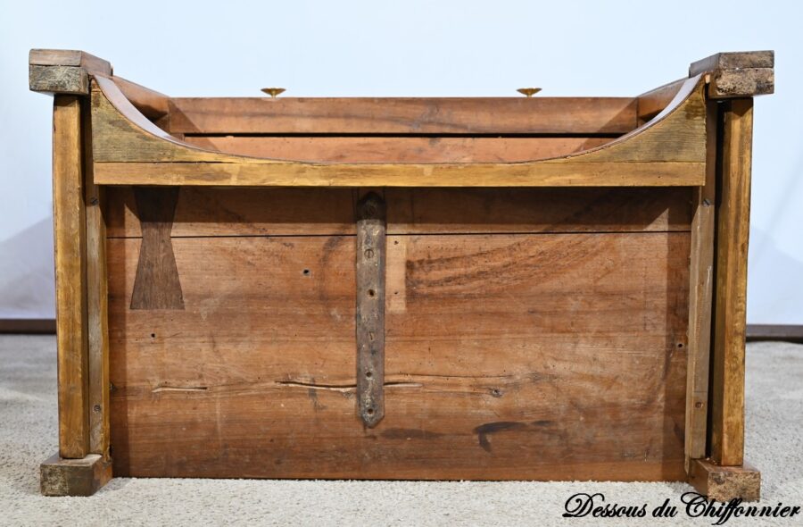 Ce meuble en noyer massif ouvre en ceinture par un tiroir en sailli à l’aide d’une gorge en dessous.