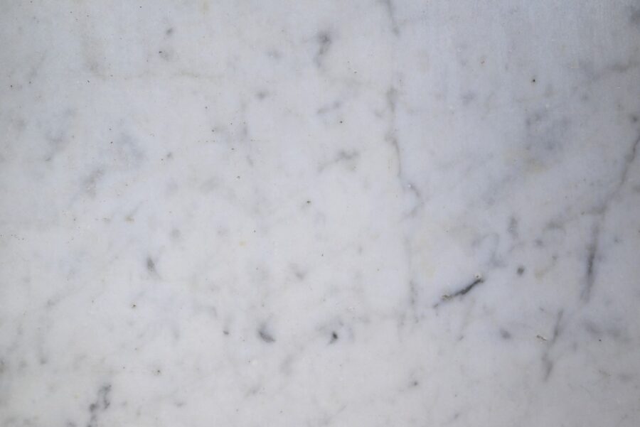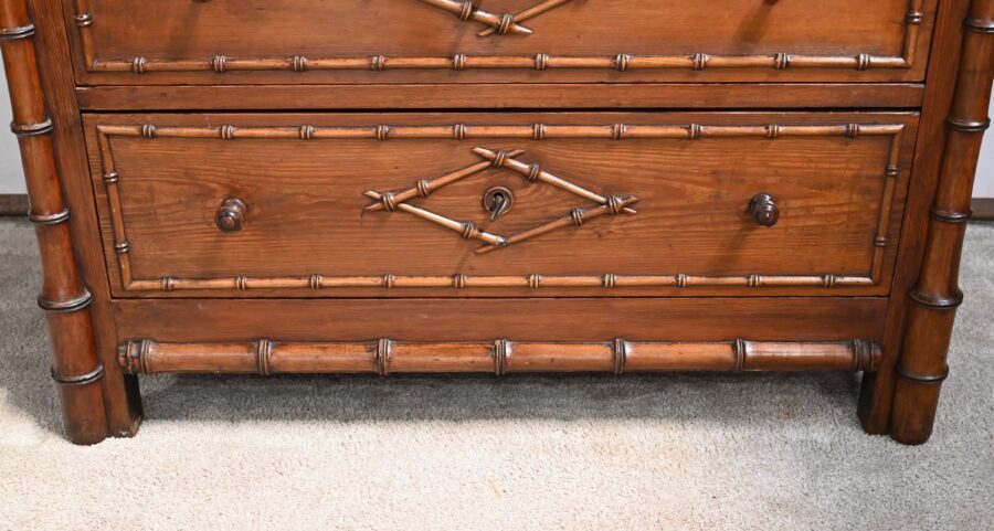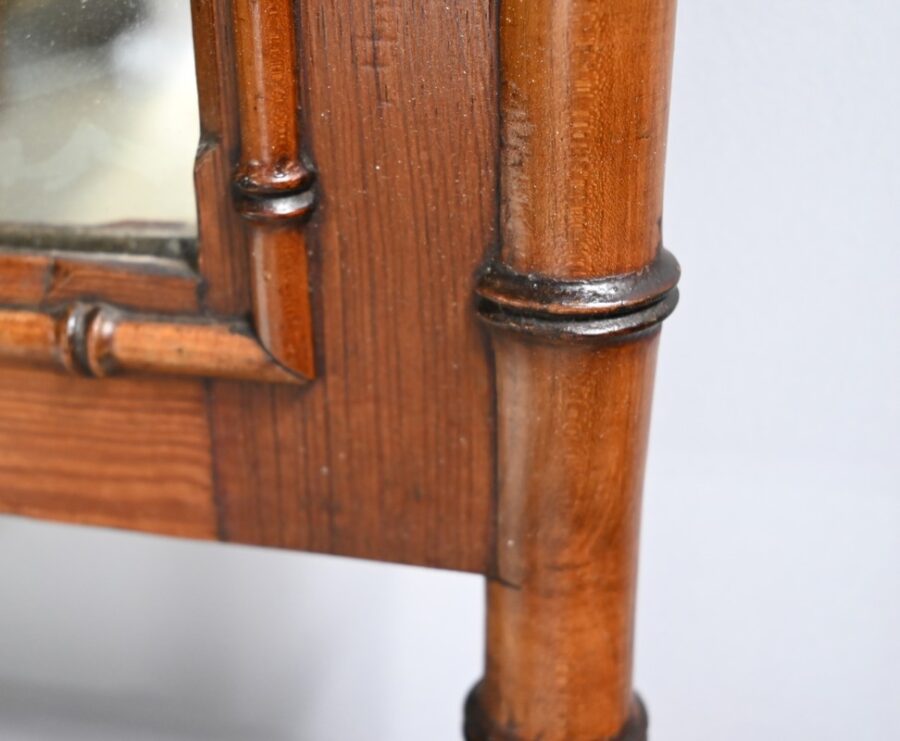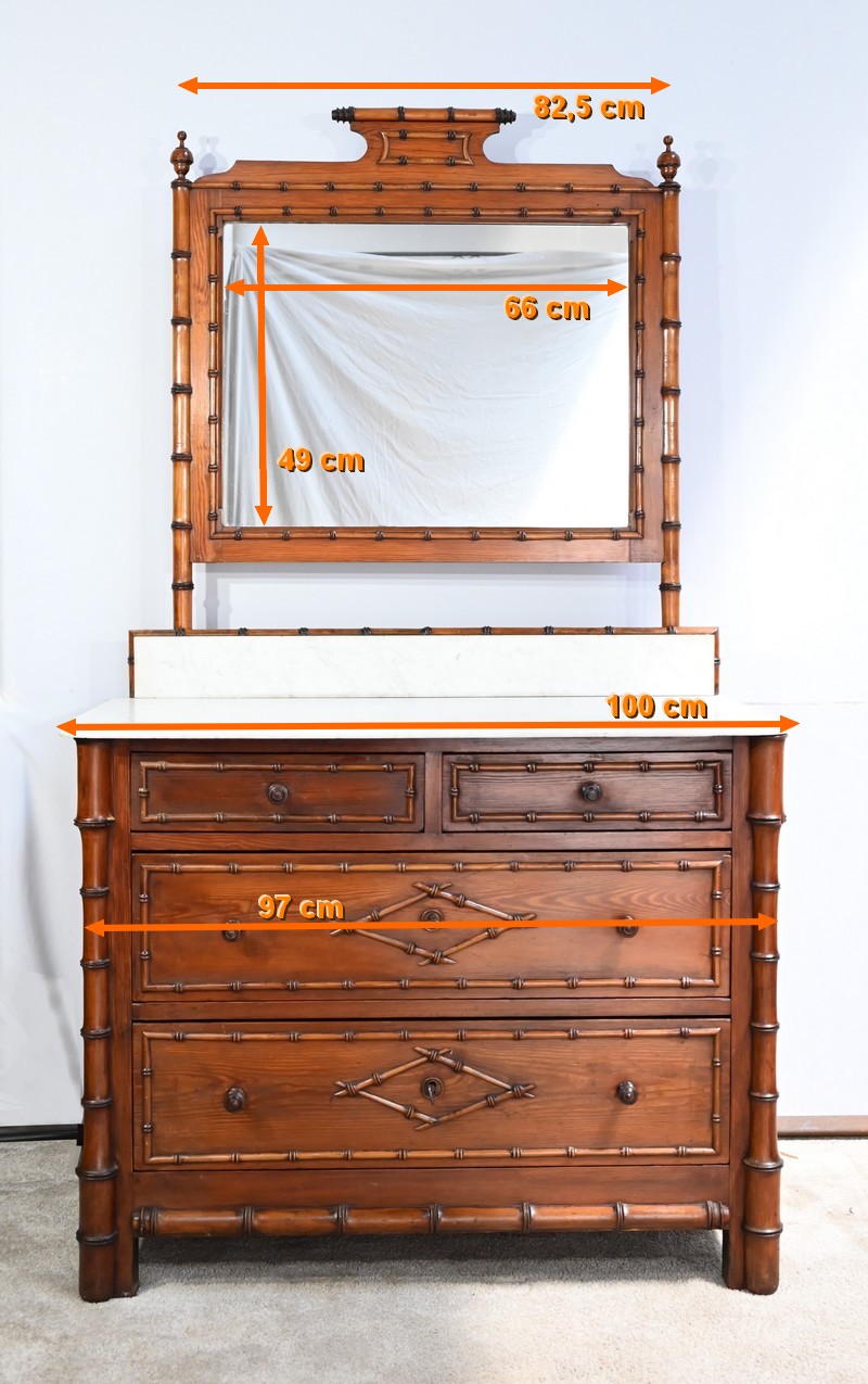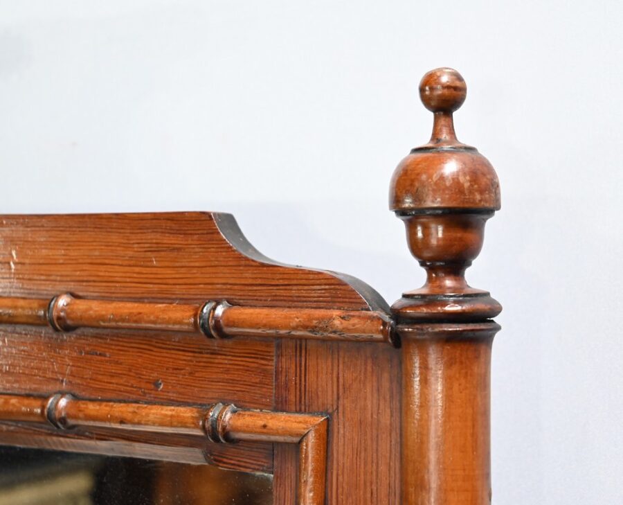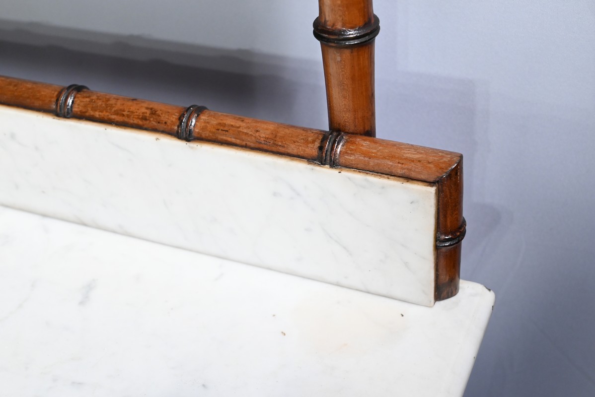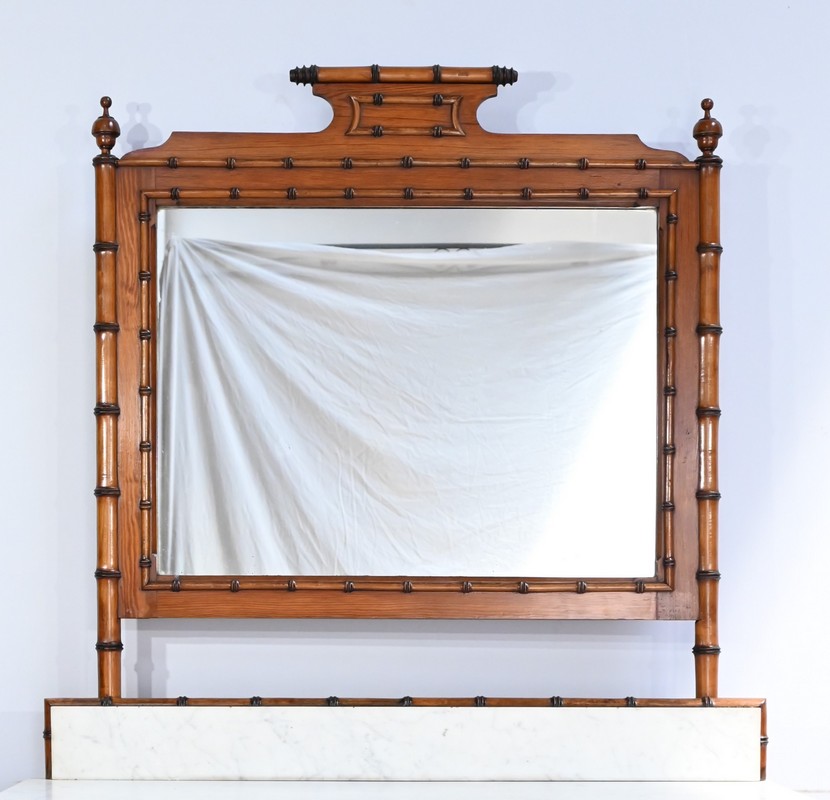 Ce meuble, sommé d’un marbre blanc de Carrare, présente un important miroir authentique foncé dans un cadre en pitchpin reprenant les mêmes décors de cette graminée qu’est le bambou.