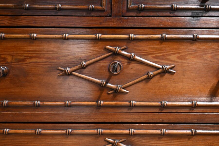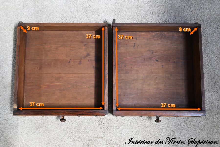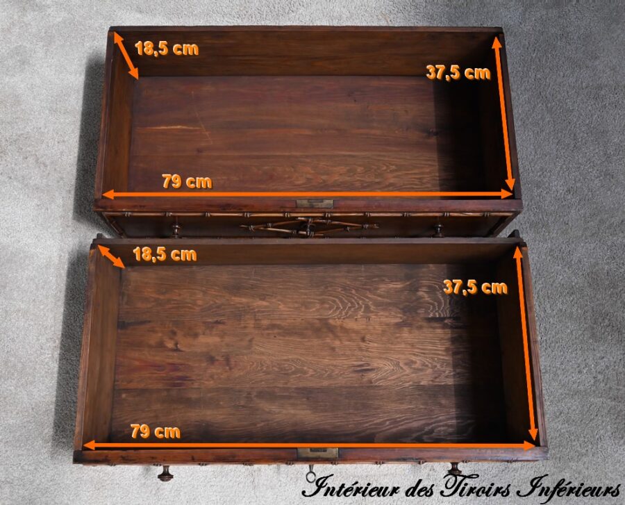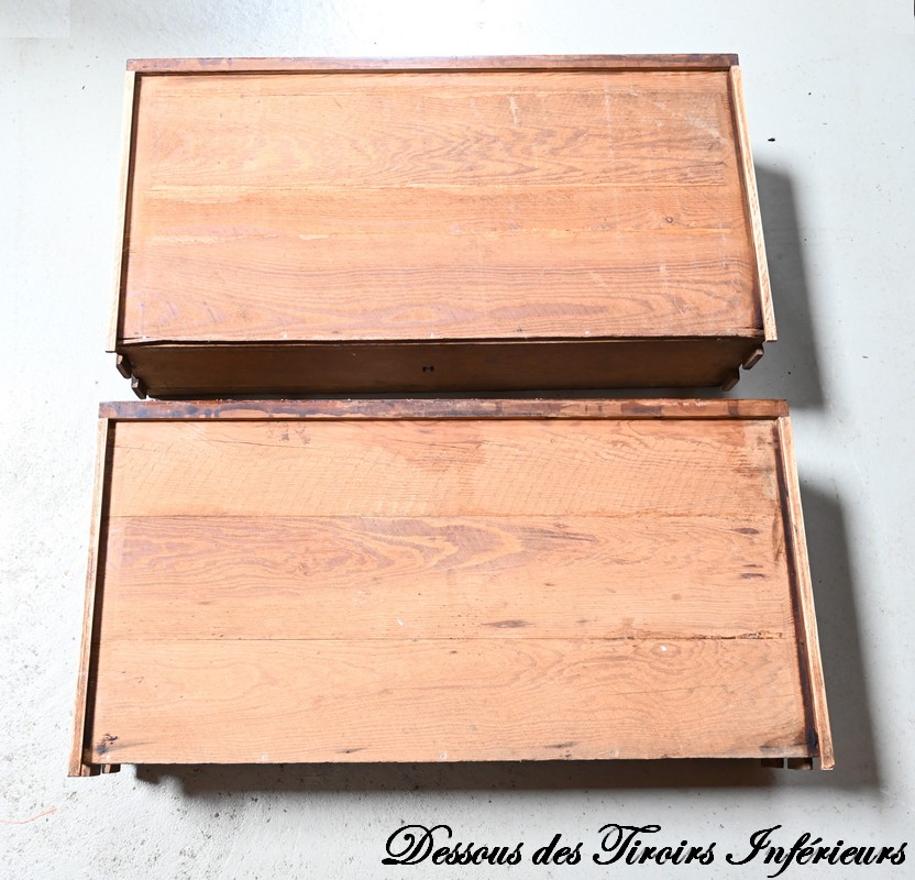 Cette partie commode propose également deux tiroirs inférieurs de plus grande dimension, ouvragés à l’identique, munis de serrures d’origine fonctionnelles avec entrées et boutons bois, soulignés de baguettes disposées en losange.