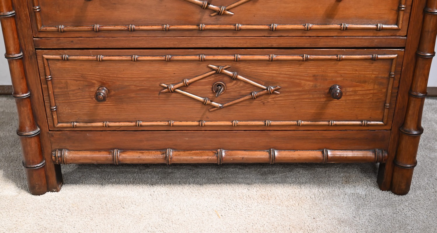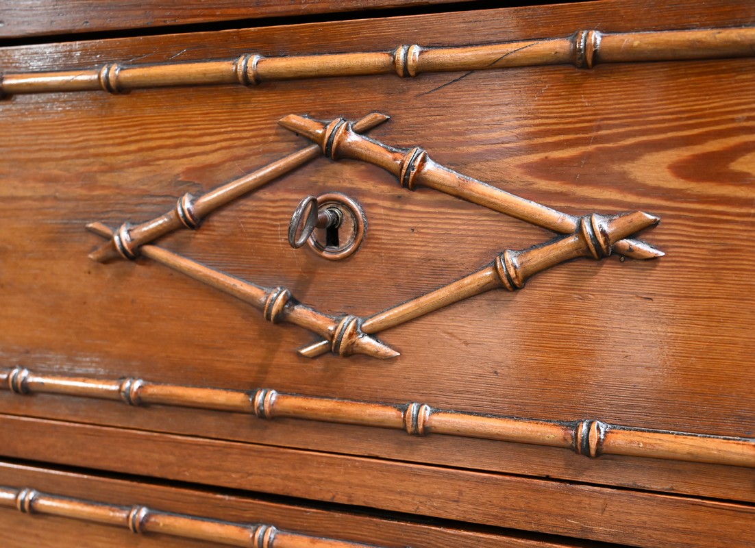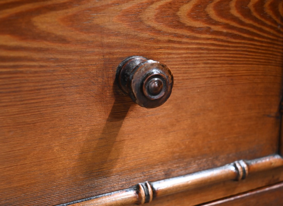 Petite commode coiffeuse en pitchpin ouvrant par deux petits tiroirs, à boutons bois, ceints de baguette reprenant les nœuds et les entre-nœuds du bambou.