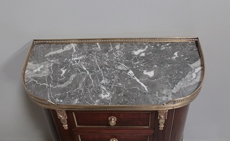 Petite commode cintrée de style Louis XVI – Directoire, en acajou et placage d’acajou. Dessus de marbre gris veiné ceinturé d’une galerie ajourée en laiton.