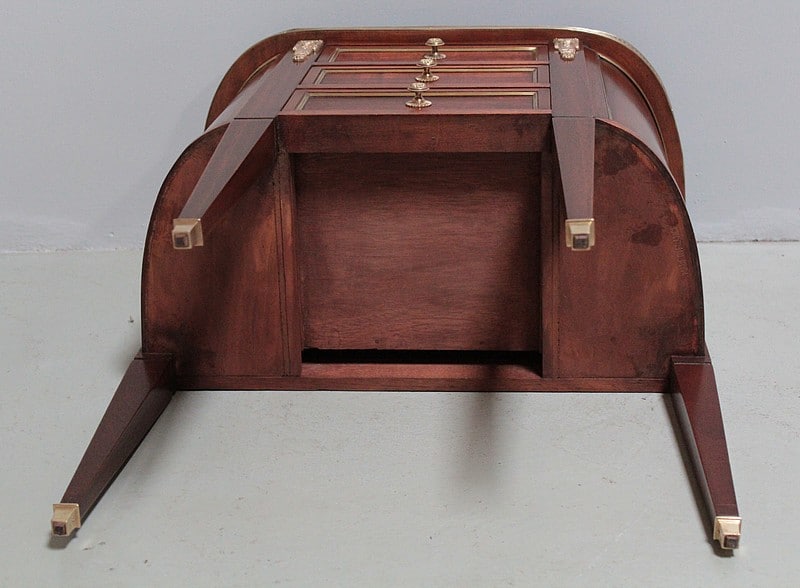 Elle ouvre par 3 tiroirs et repose sur 4 pieds gaine avec sabots de bronze. Boutons et chutes en bronze.