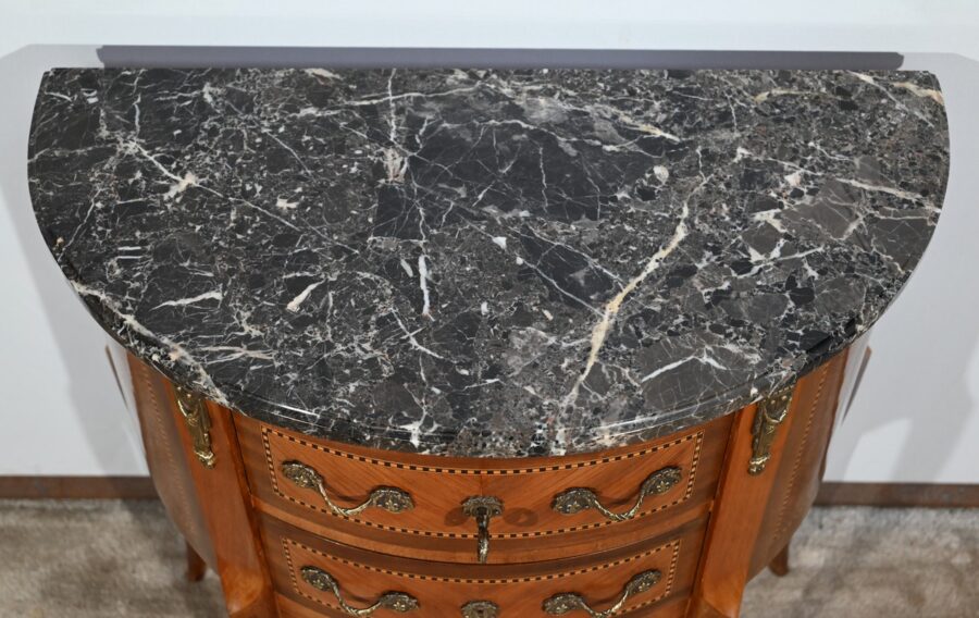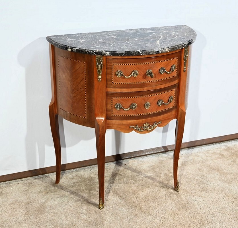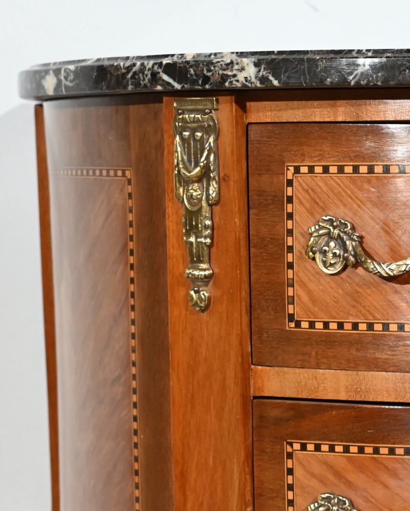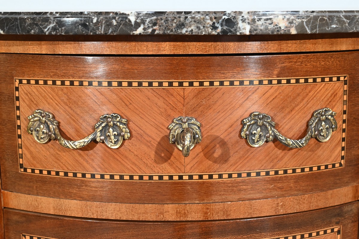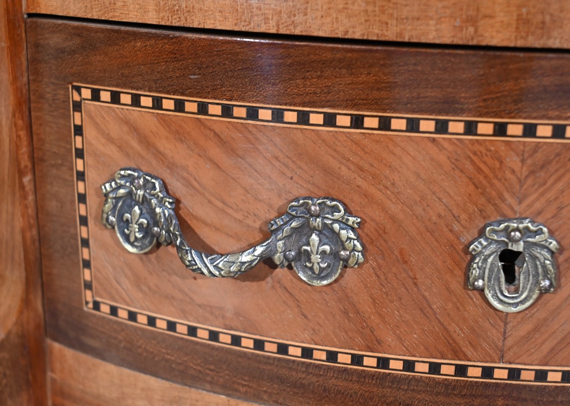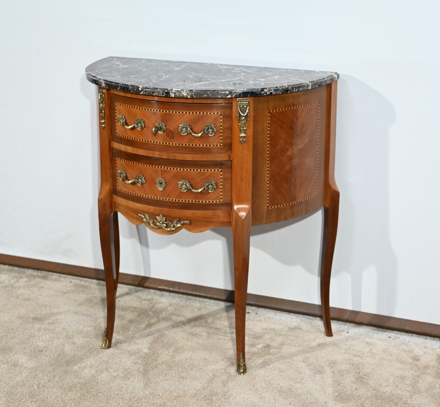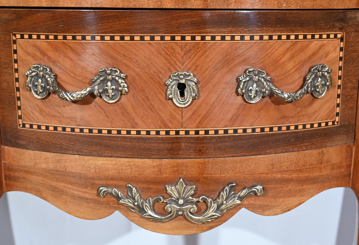 Cette petite commode demi-lune en bois de rose plaira pour son dimensionnel et la qualité de ses essences.