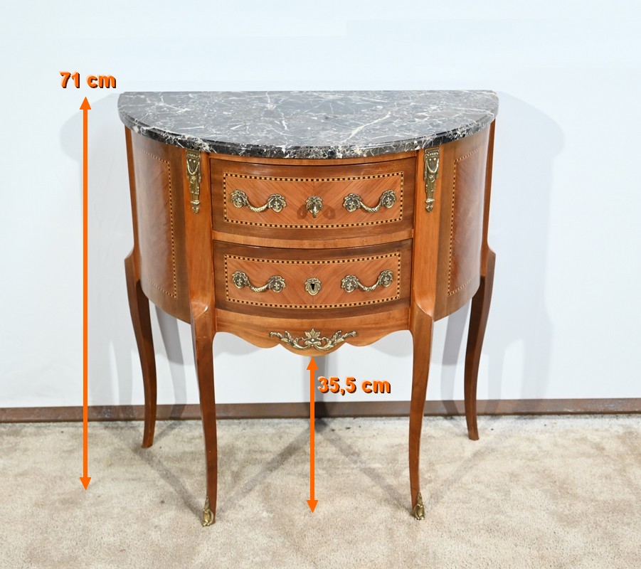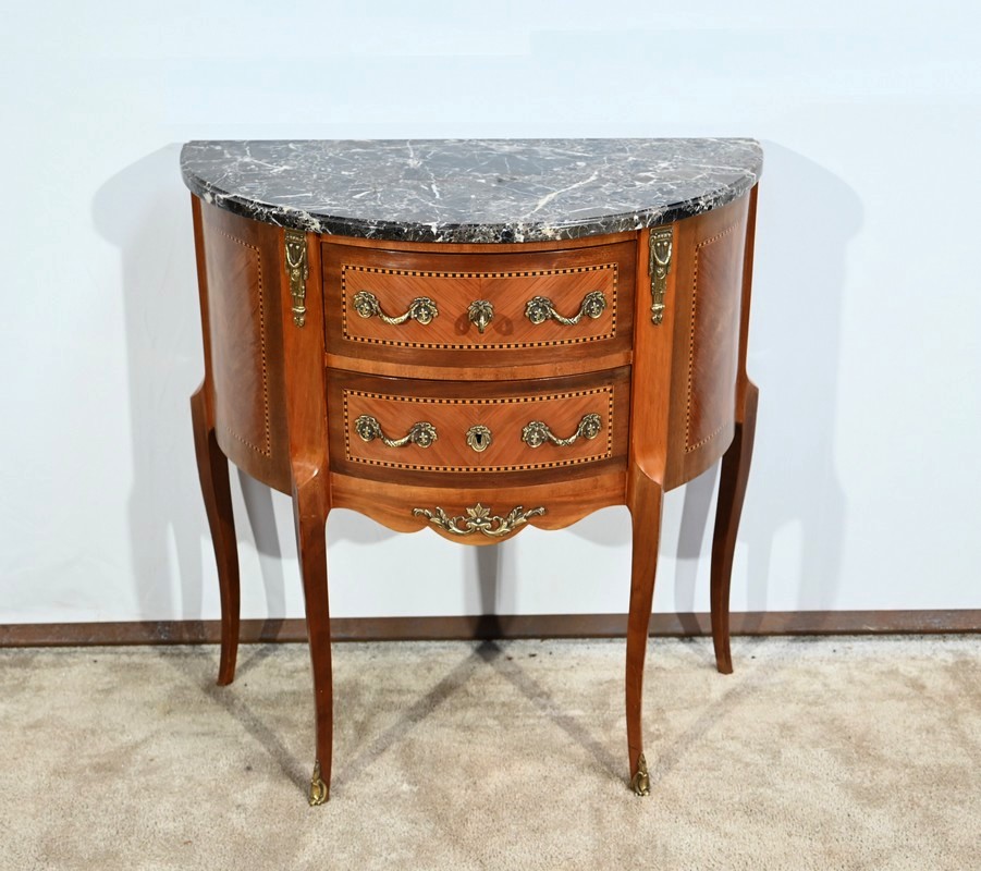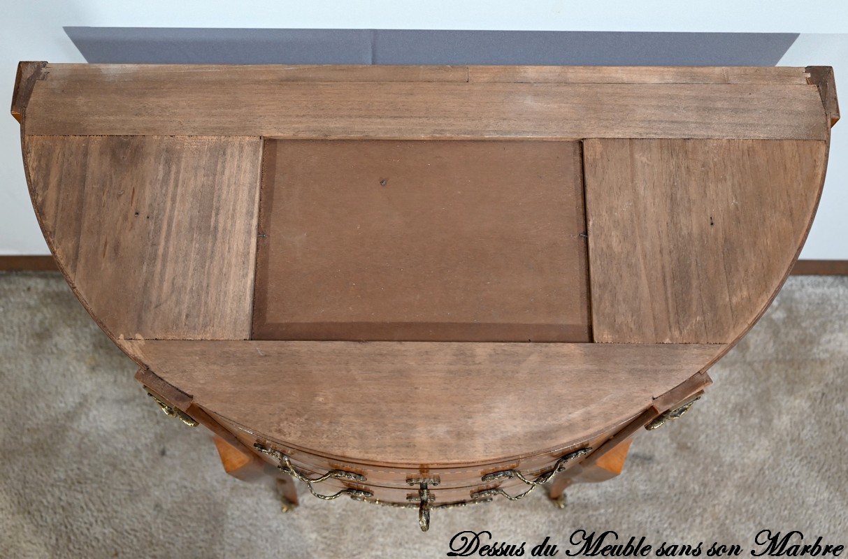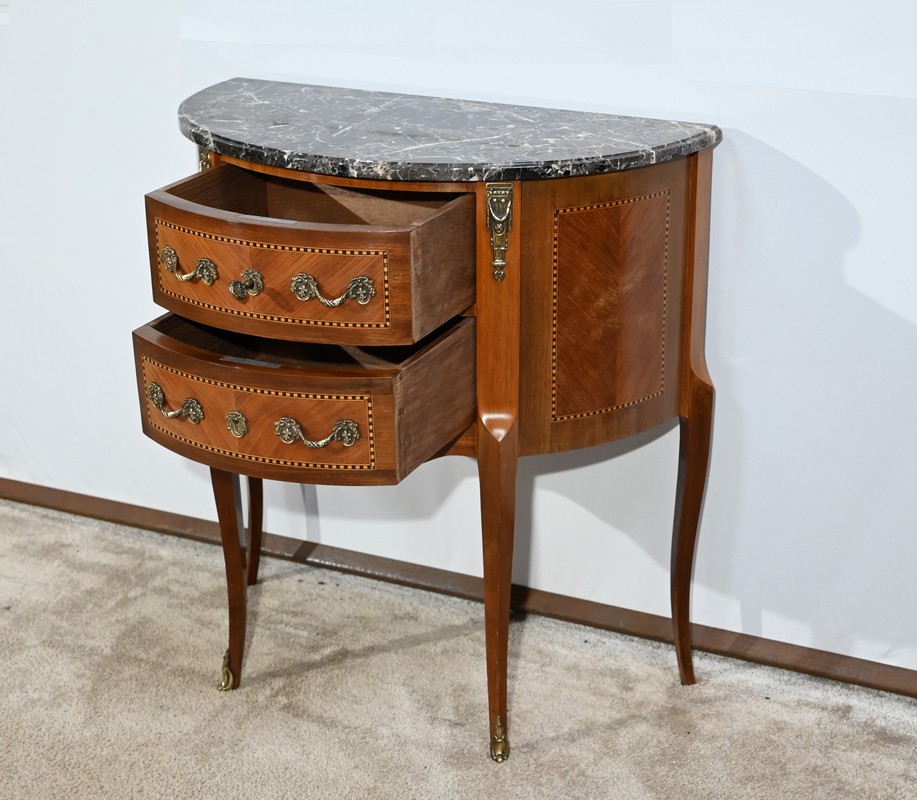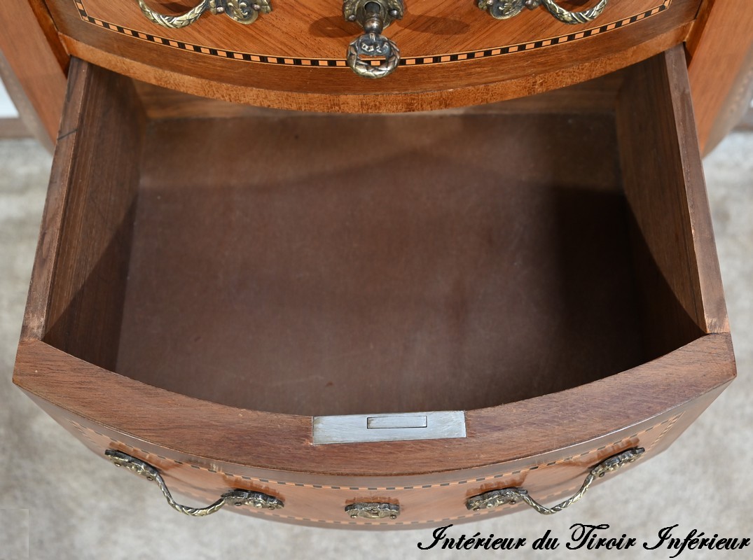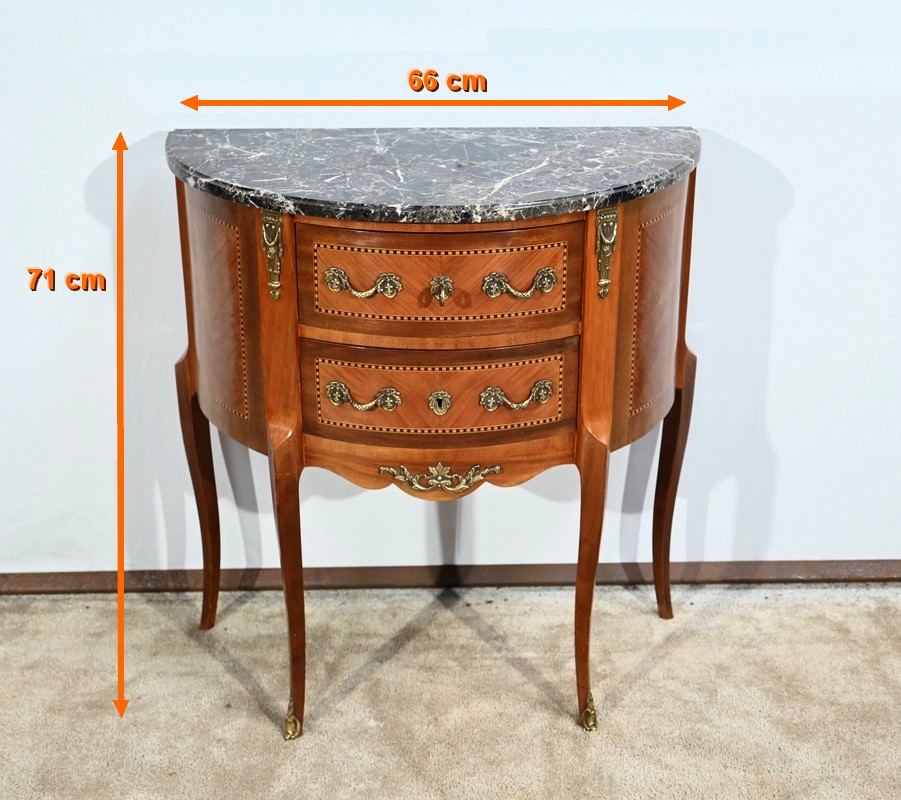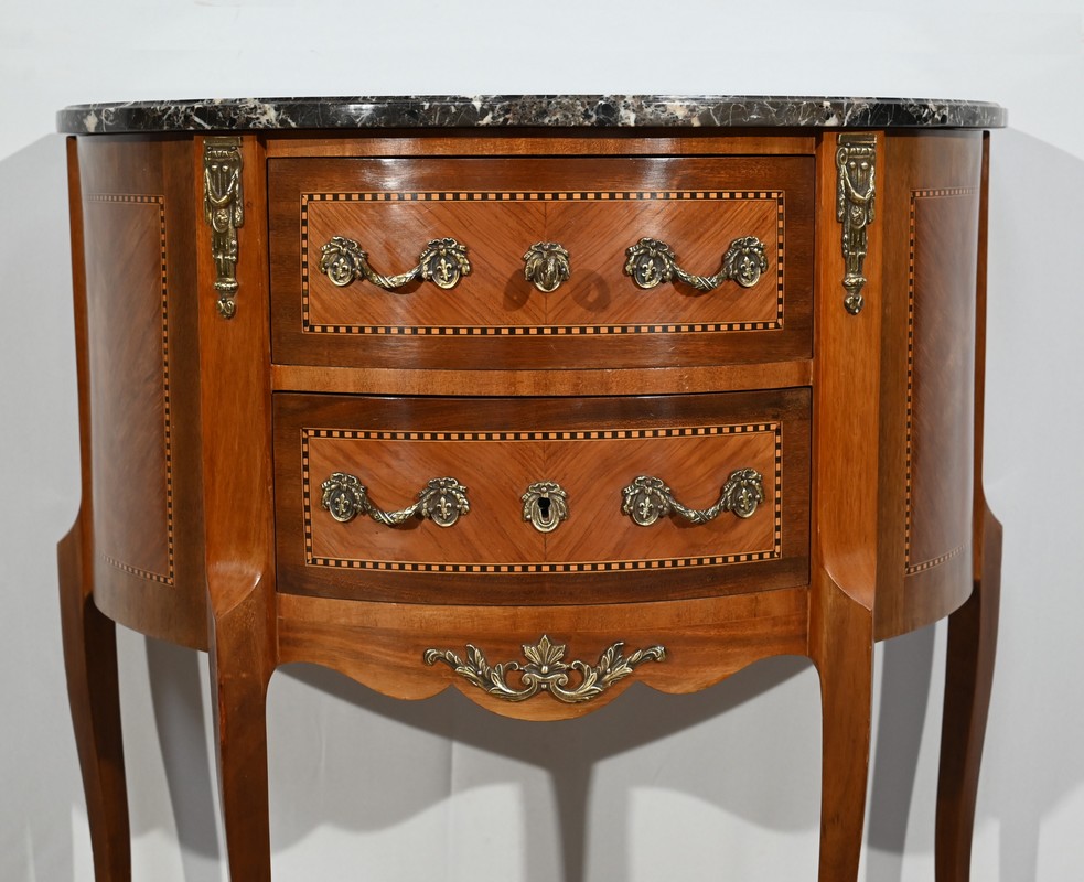 Cette petite commode demi-lune en bois de rose plaira pour son dimensionnel et la qualité de ses essences.