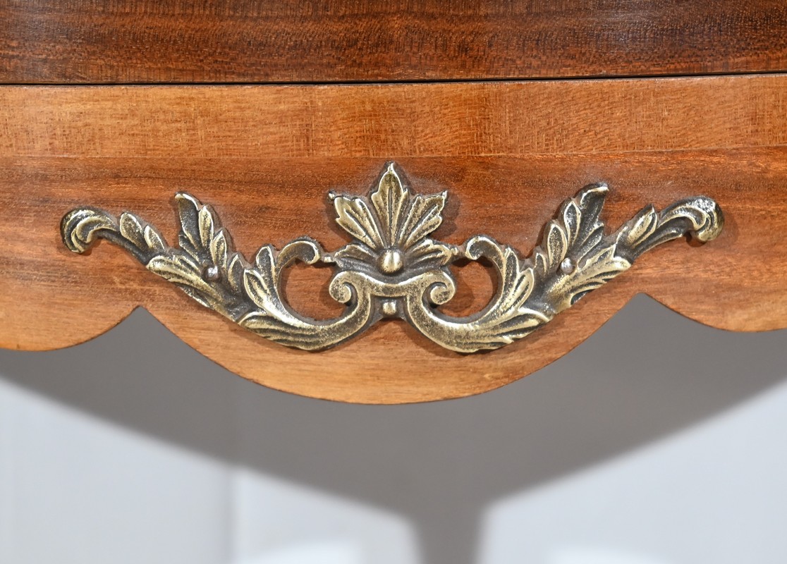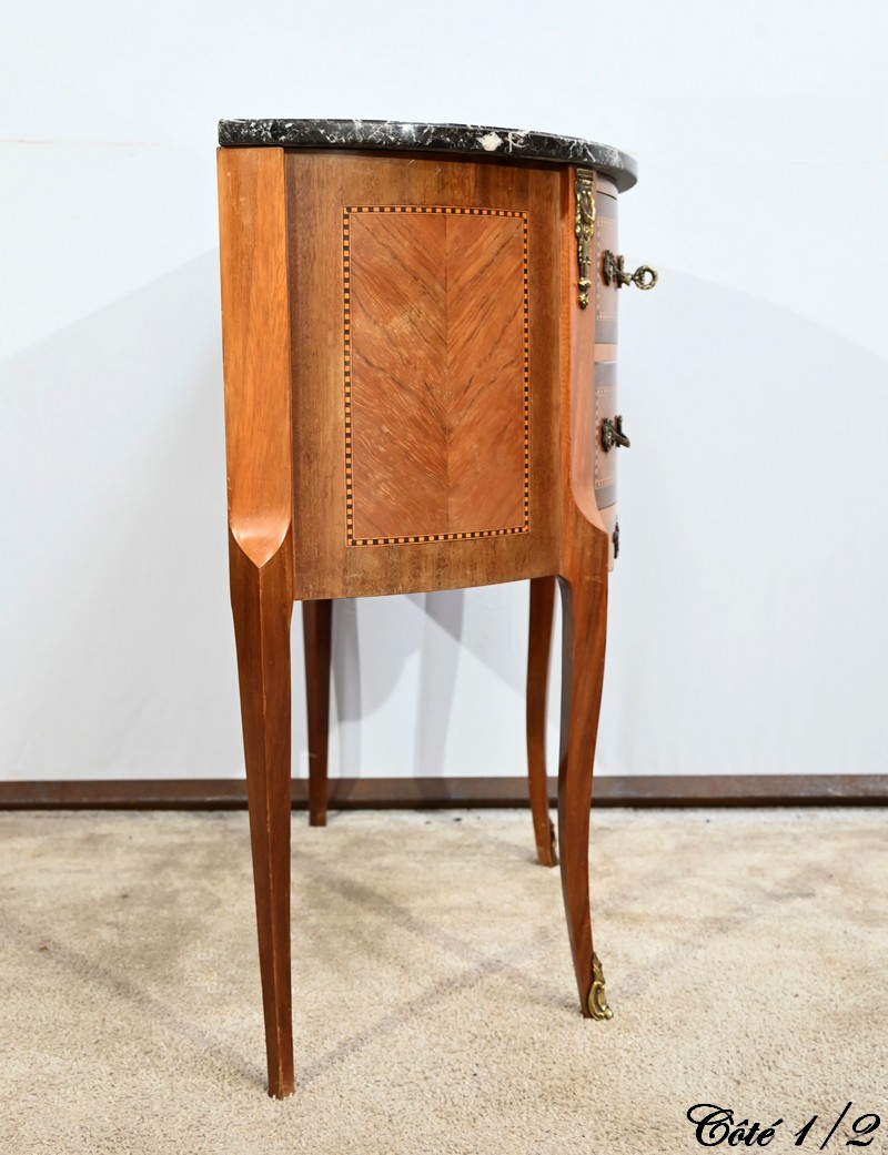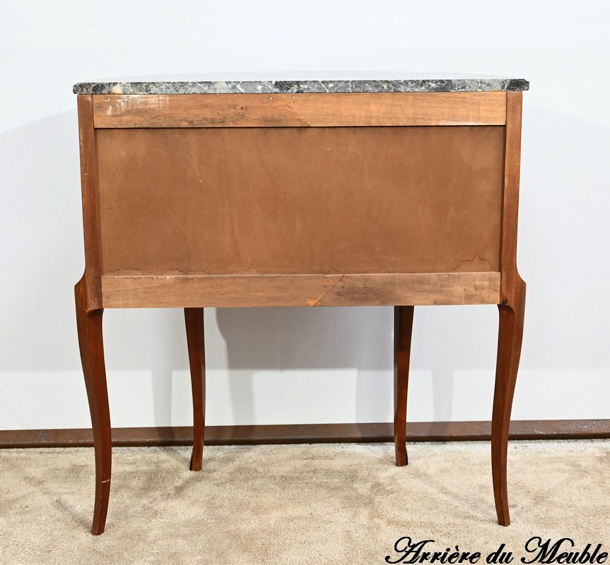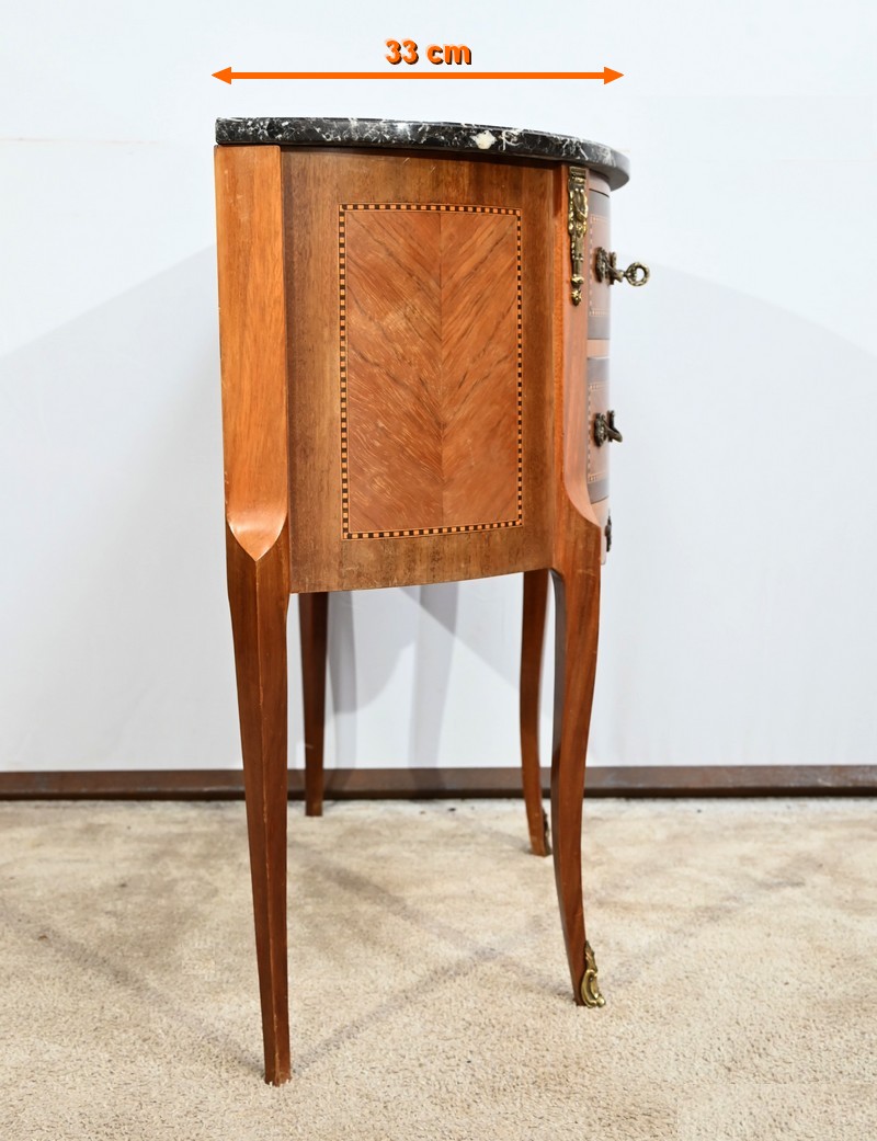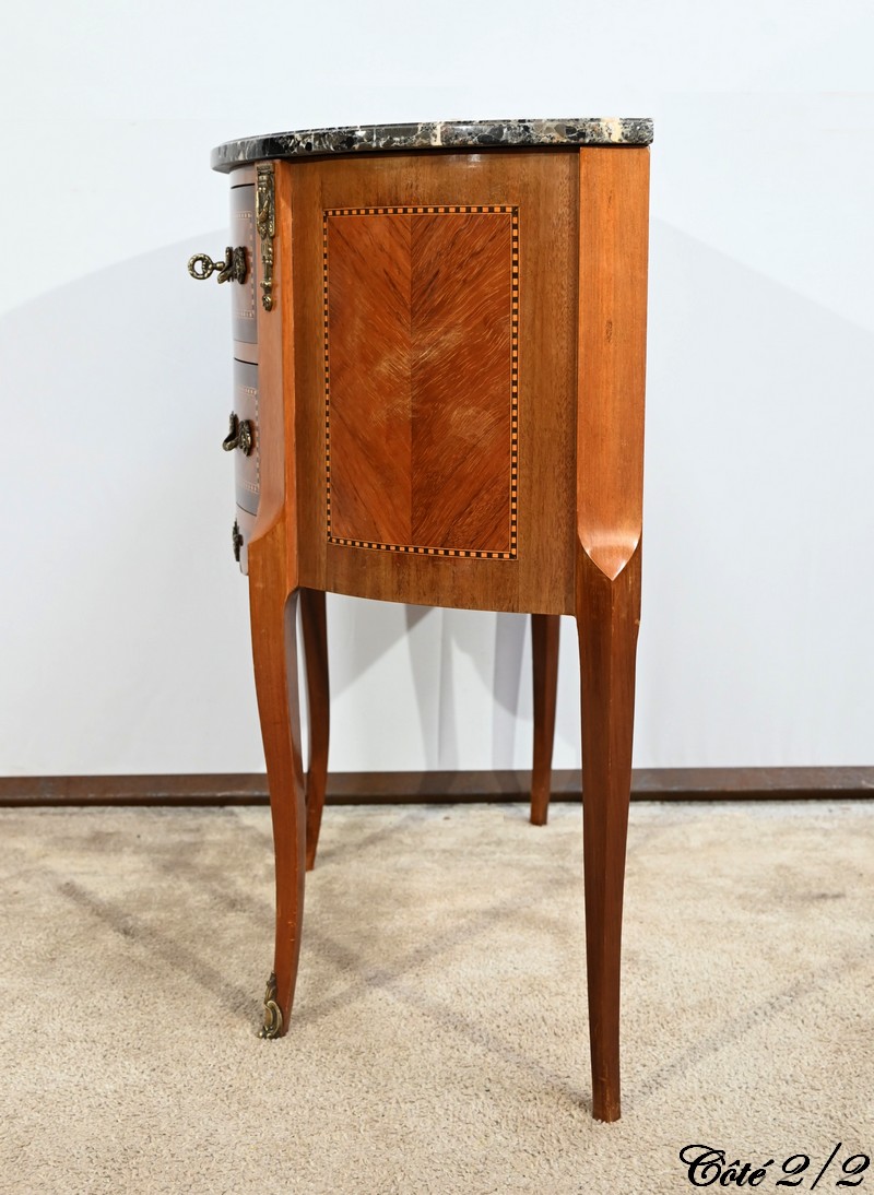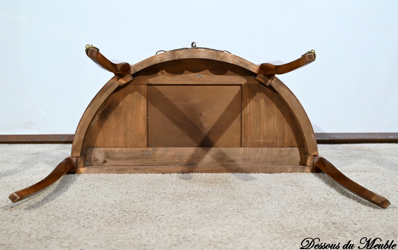 Cette petite commode demi-lune en bois de rose plaira pour son dimensionnel et la qualité de ses essences.