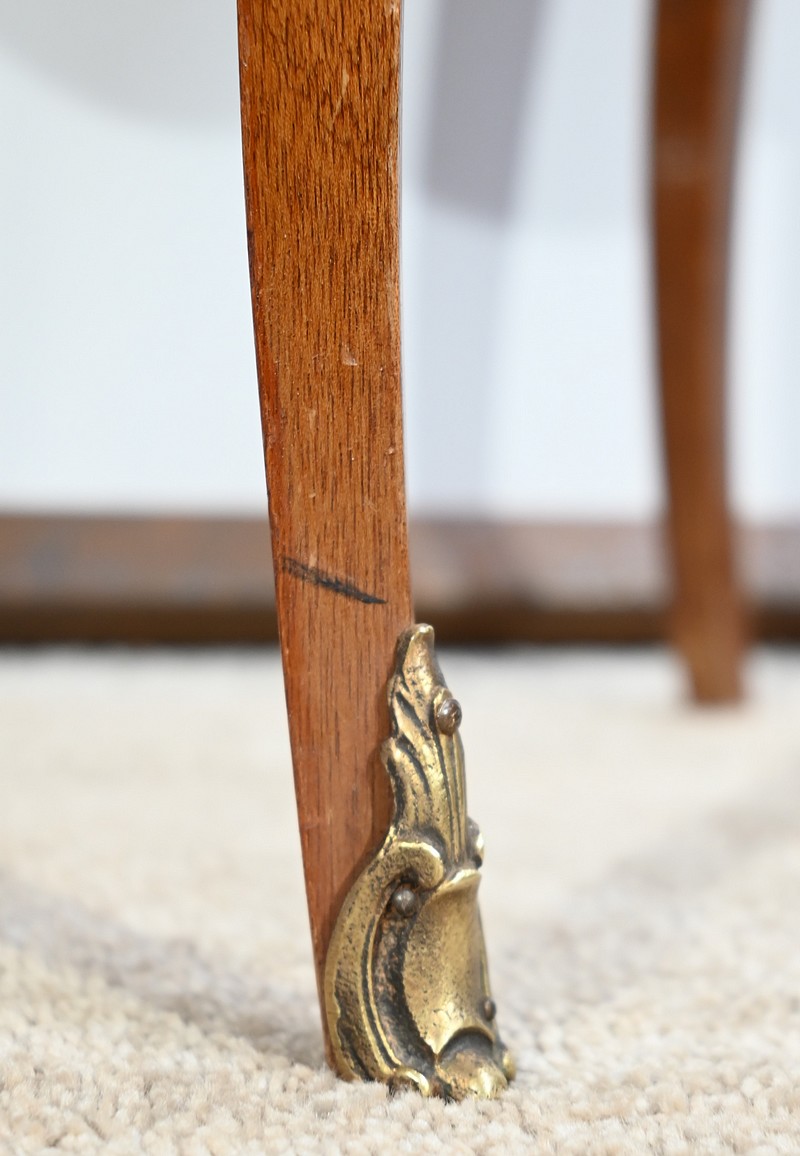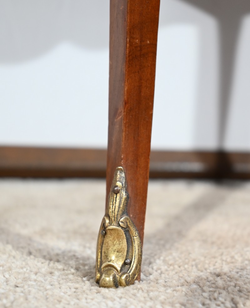 Les montants, mis en valeur par des chutes de bronze, sont plats et se transforment au niveau de la ceinture par des pieds quatre pans Louis XV s’affinant vers un petit sabot.