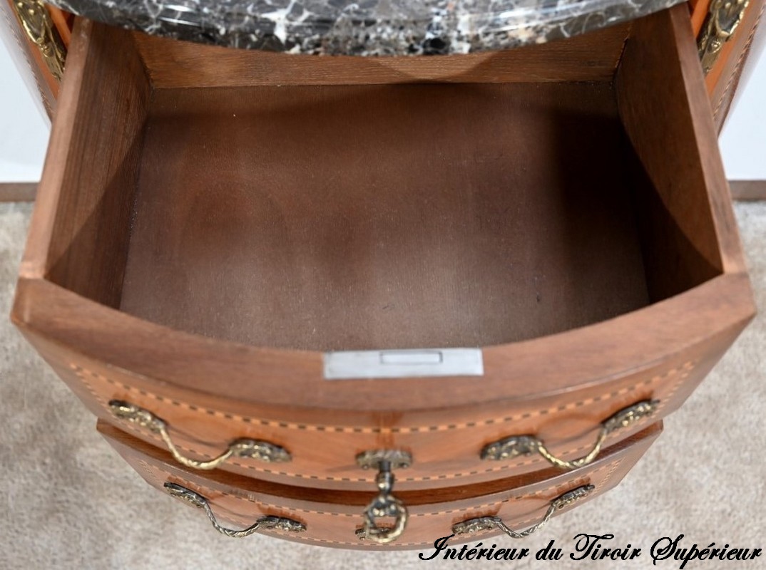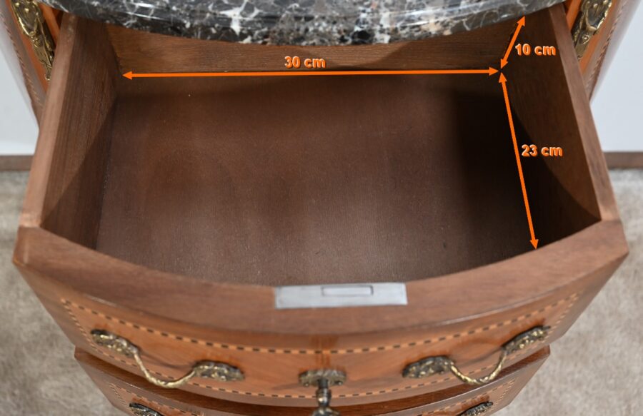 Chacun de ces tiroirs, agrémentés de poignées en bronze à décor de cordelette et de fleurs de lys, comprend une serrure d’origine fonctionnelle avec entrée et clé.