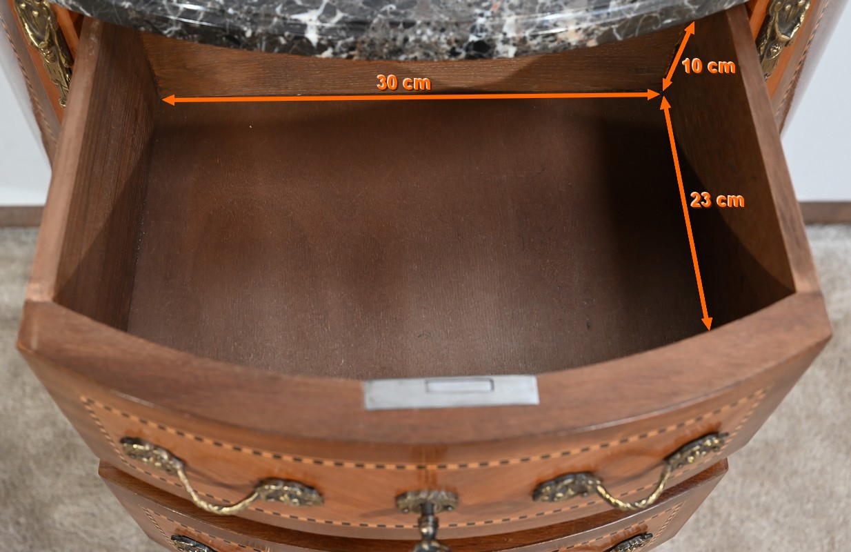 Cette petite commode demi-lune d’entre deux ouvre par deux tiroirs identiques.