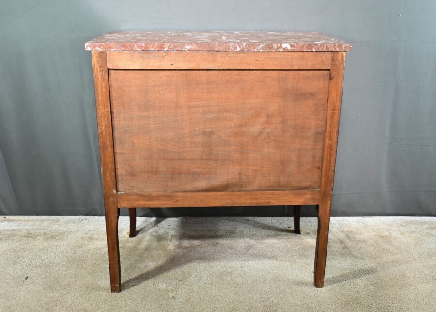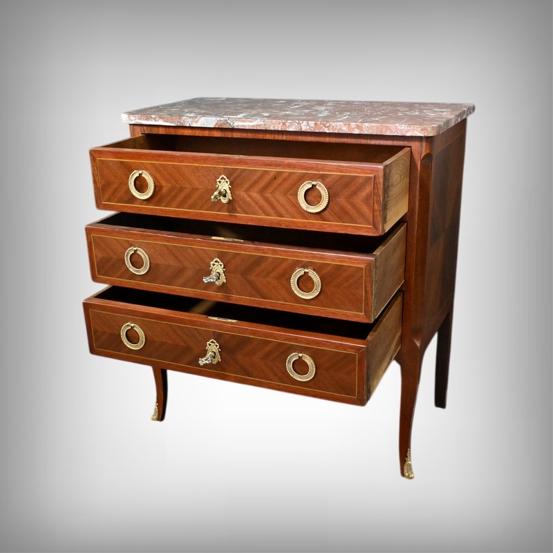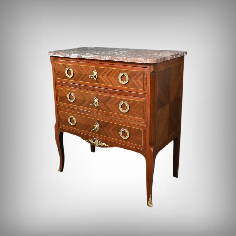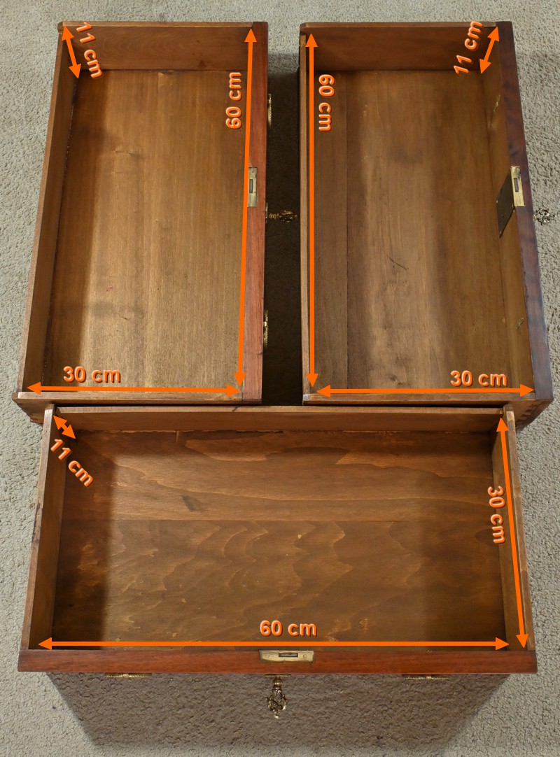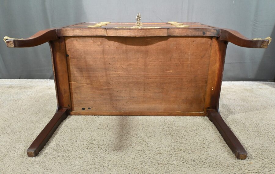 Ouvrant par trois tiroirs, en placage disposé en quatre feuilles avec filets de bois teinté, ornés d’anneaux en bronze et équipés de serrures, elle conjugue fonctionnalité et élégance.