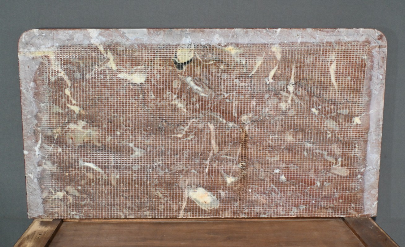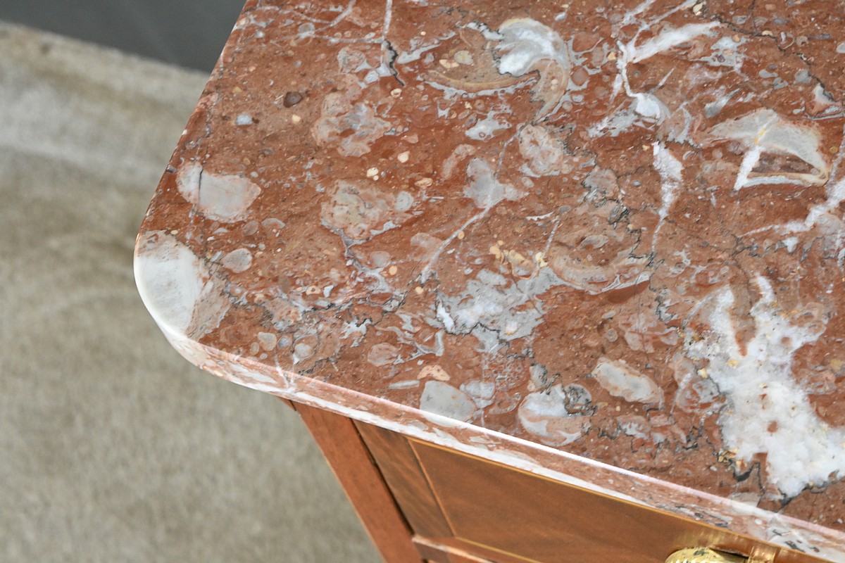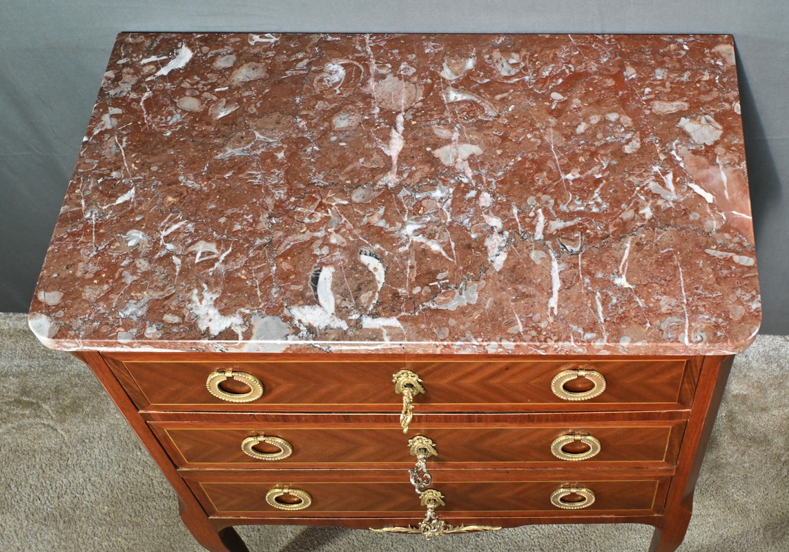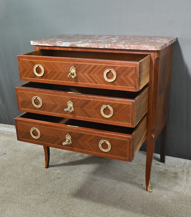 Ouvrant par trois tiroirs, en placage disposé en quatre feuilles avec filets de bois teinté, ornés d’anneaux en bronze et équipés de serrures, elle conjugue fonctionnalité et élégance.
