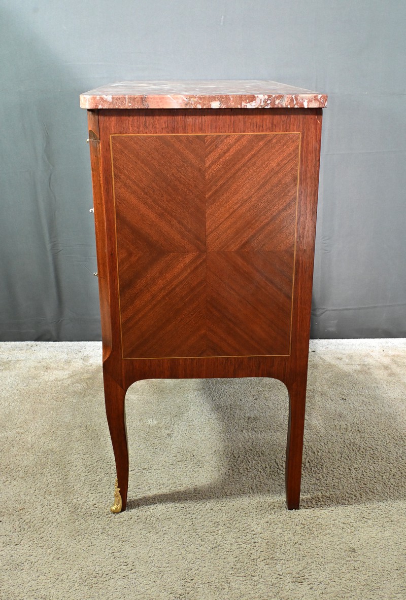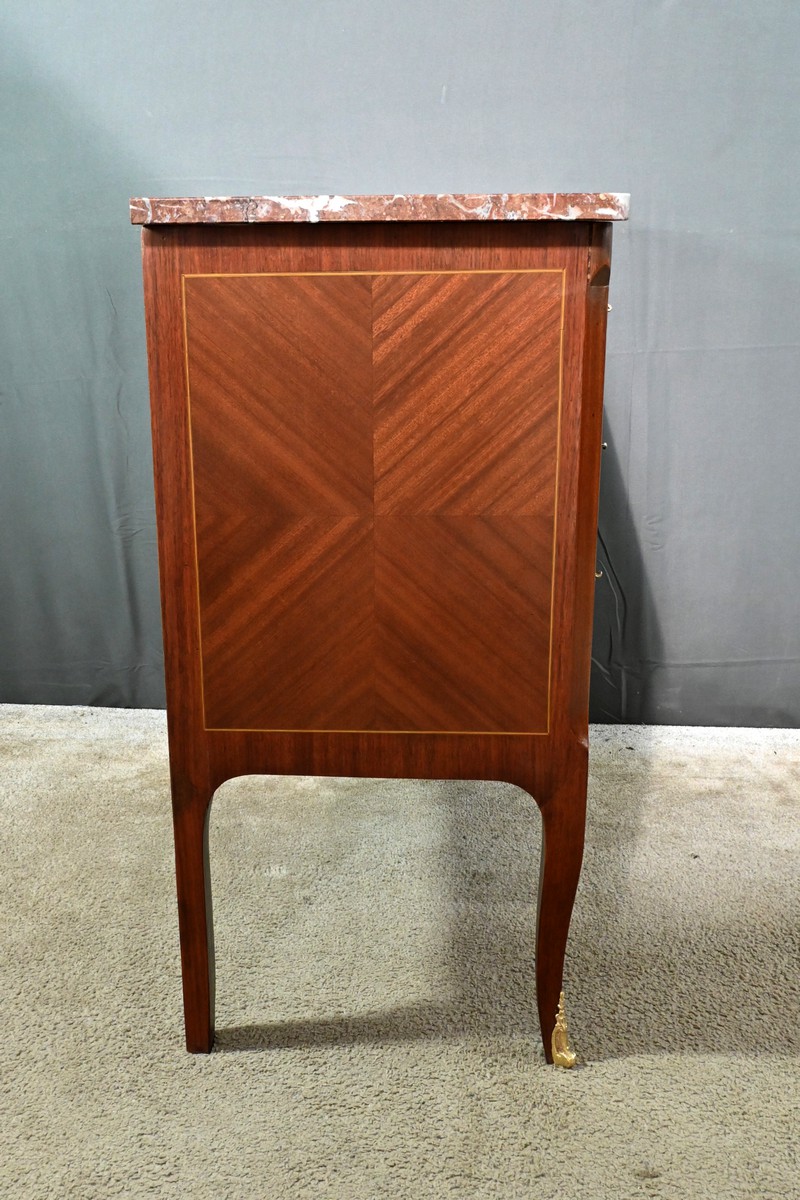 Reposant à l’avant sur deux pieds légèrement galbés et chaussés de sabots en bronze, cette commode affiche une silhouette classique et sophistiquée.