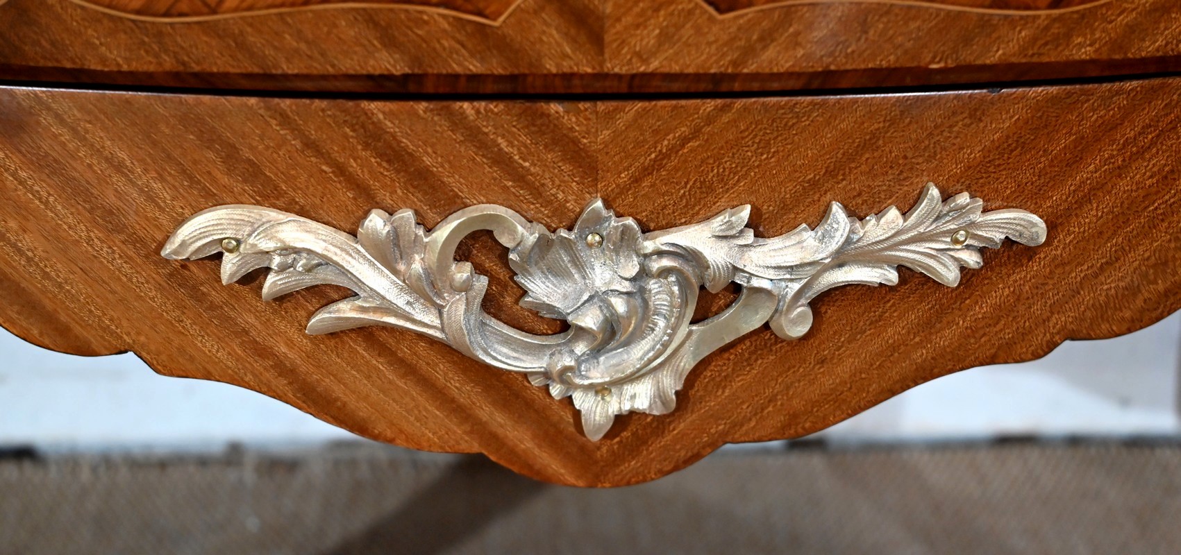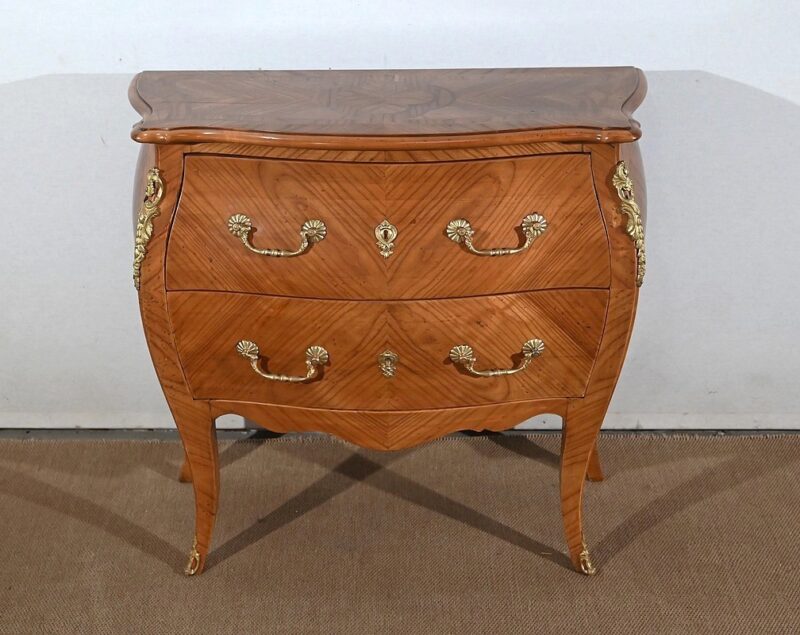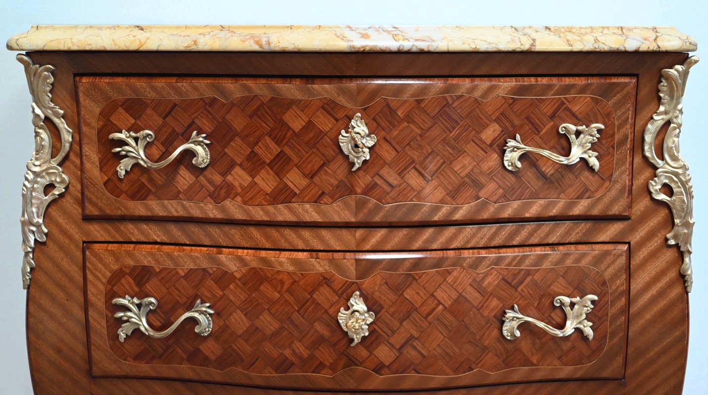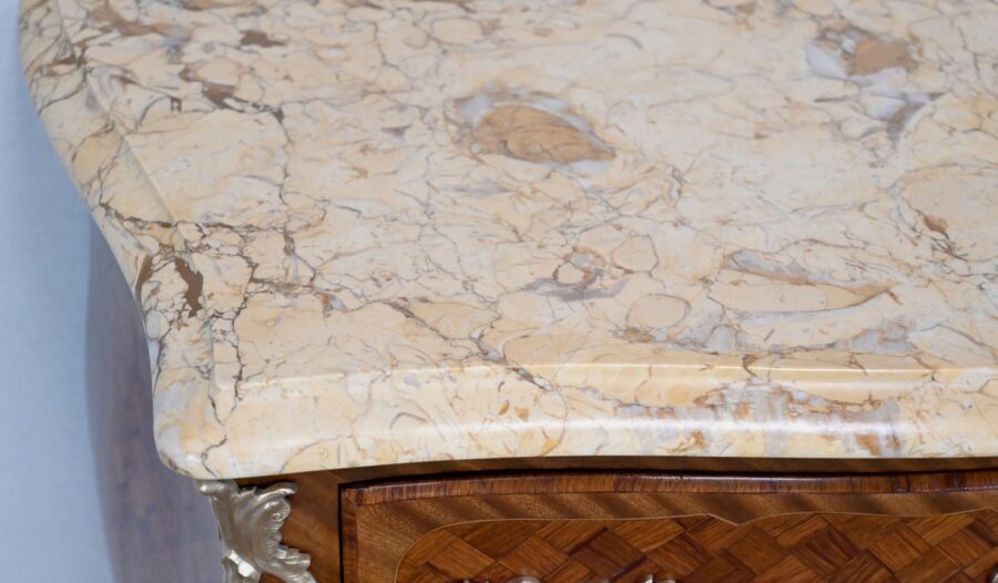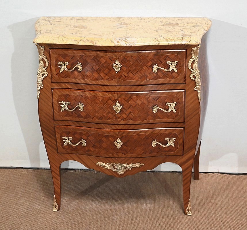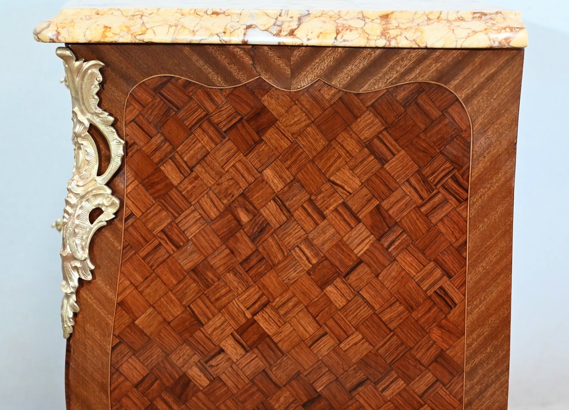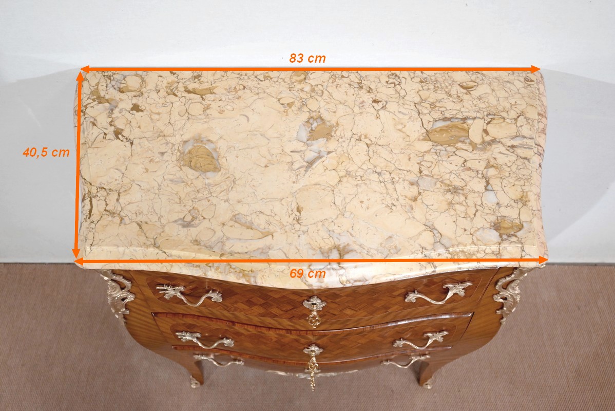 Petite commode en bois précieux, dotée d’une façade galbée et ventrue. Ce meuble est sommé d’un marbre brocatelle aux nuances jaune et Terre de Sienne à l’arête moulurée en gorge et bec-de-corbin.