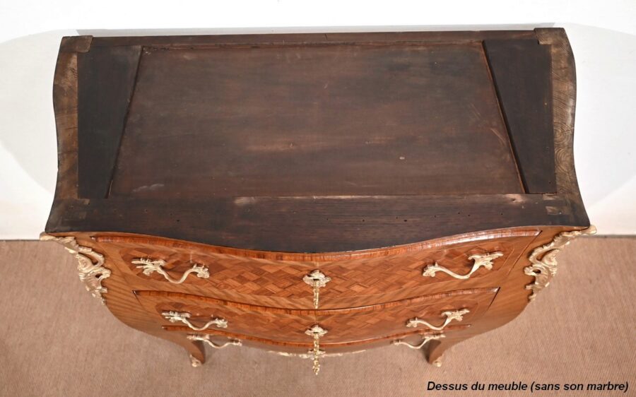 Les côtés sont galbés et ventrus dans le même esprit de marqueterie.