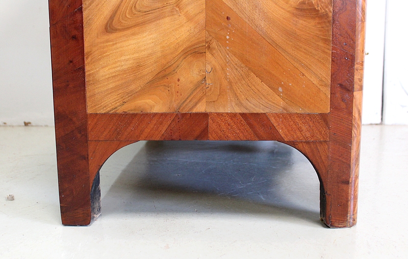 La Façade élégamment Galbée de ce Meuble ouvre par trois Tiroirs, enjolivés pour chacun d’eux d’un motif central en Losange entouré d’un filet Blond. Ils arborent également des placages en Bois If, soulignés par des incrustations en Citronnier formant encadrements. Ces tiroirs offrent une profondeur identique de 15 cm et sont séparés entre eux par des Traverses apparentes Marquetées en Chevrons. Tous sont munis d’une entrée et d’une serrure en état de fonctionnement, accompagnée de leur clé, en Bronze. Ils sont également pourvus de poignées de Tirage esprit Rocaille, conçues dans le même Alliage.